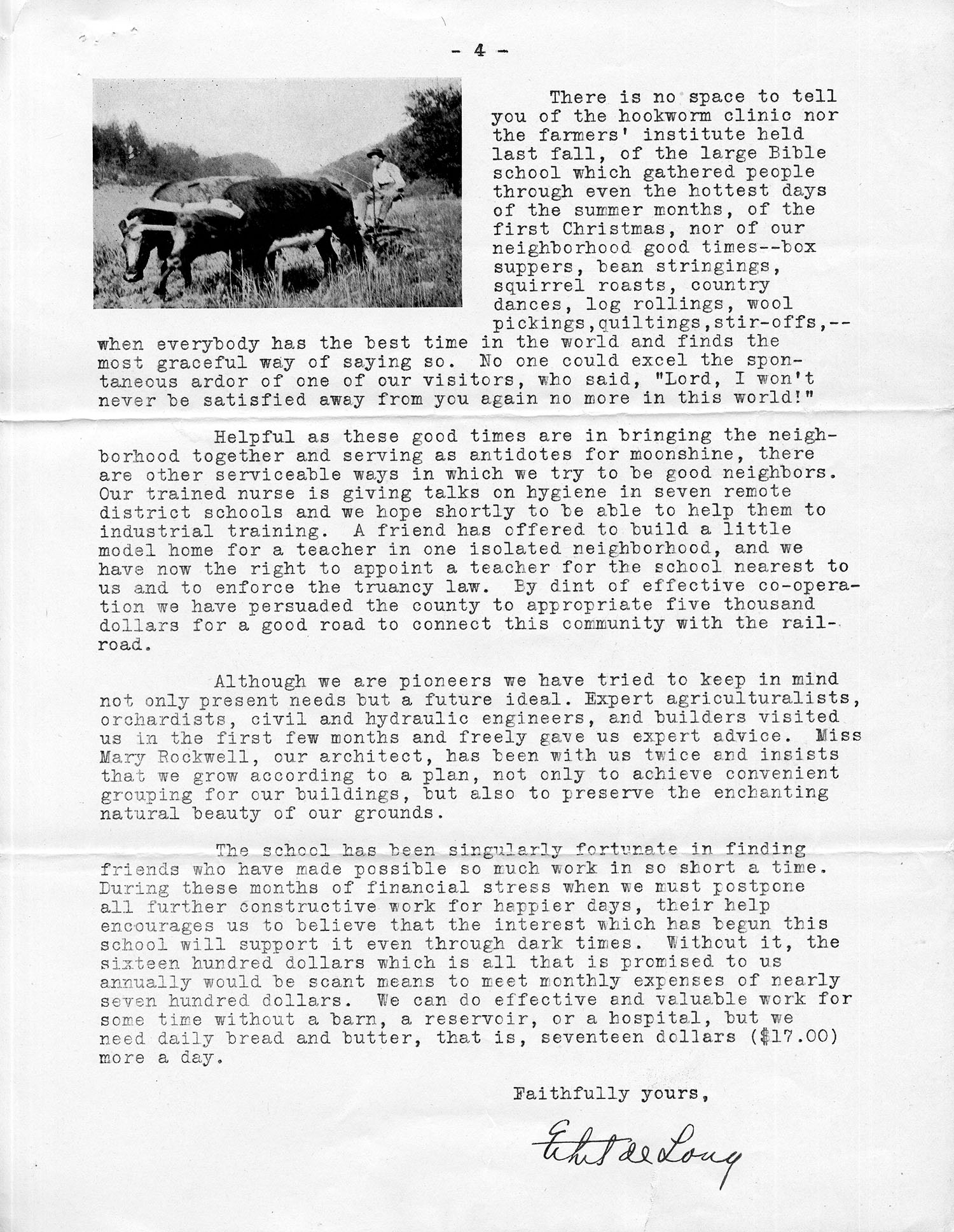 The school has been singularly fortunate in finding friends who have made possible so much work in so short a time. During these months of financial stress when we must postpone all further constructive work for happier days, their help encourages us to believe that the interest which has begun this school will support it even through dark times. Without it, the sixteen hundred dollars which is all that is promised to us annually would be scant means to meet monthly expenses of nearly seven hundred dollars. We can do effective and valuable work for some time without a barn, a reservoir, or a hospital, but we need daily bread and butter, that is, seventeen dollars ($17.00) more a day.