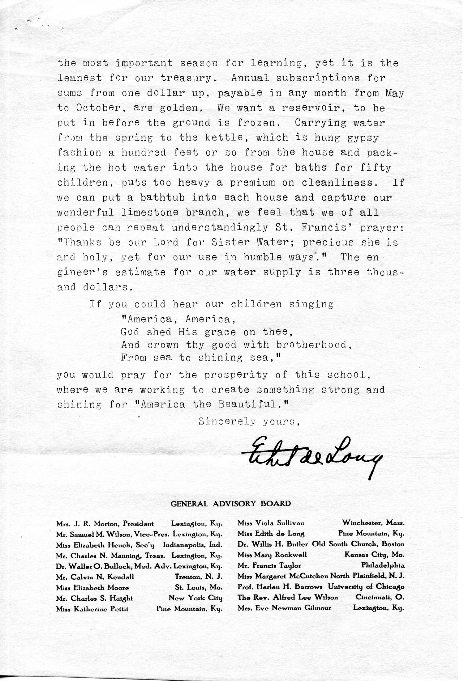…the most important season for learning, yet it is the leanest for our treasury. Annual subscriptions for sums from one dollar up, payable in any month from May to October, are golden. We want a reservoir, to be put in before the ground is frozen. Carrying water from the spring to the kettle, which is hung gypsy fashion a hundred feet or so from the house and packing the hot water into the house for baths for fifty children, put too heavy a premium on cleanliness. If we can put a bathtub into each house and capture our wonderful limestone branch, we feel that we of all people can repeat understandingly St. Francis’ prayer: “Thanks be our Lord for Sister Water; precious she is and holy, yet for our use in humble ways.” The engineer’s estimate for our water supply is three thousand dollars.