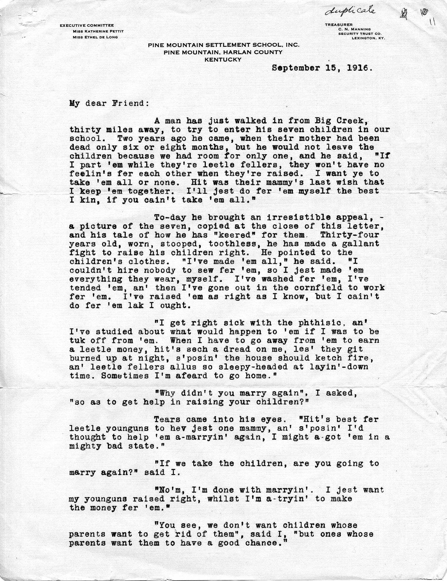 A man has just walked in from Big Creek, thirty miles away, to try to enter his seven children in our school. Two years ago he came, when their mother had been dead only six or eight months, but he would not leave the children because we had room for only one, and he said, “If I part ’em while they’re leetle fellers, they won’t have no feelin’s fer each other when they’re raised. I want ye to take ’em all or none. Hit was their mammy’s last wish that I keep ’em together. I’ll jest do fer ’em myself the best I kin, if you cain’t take ’em all.”