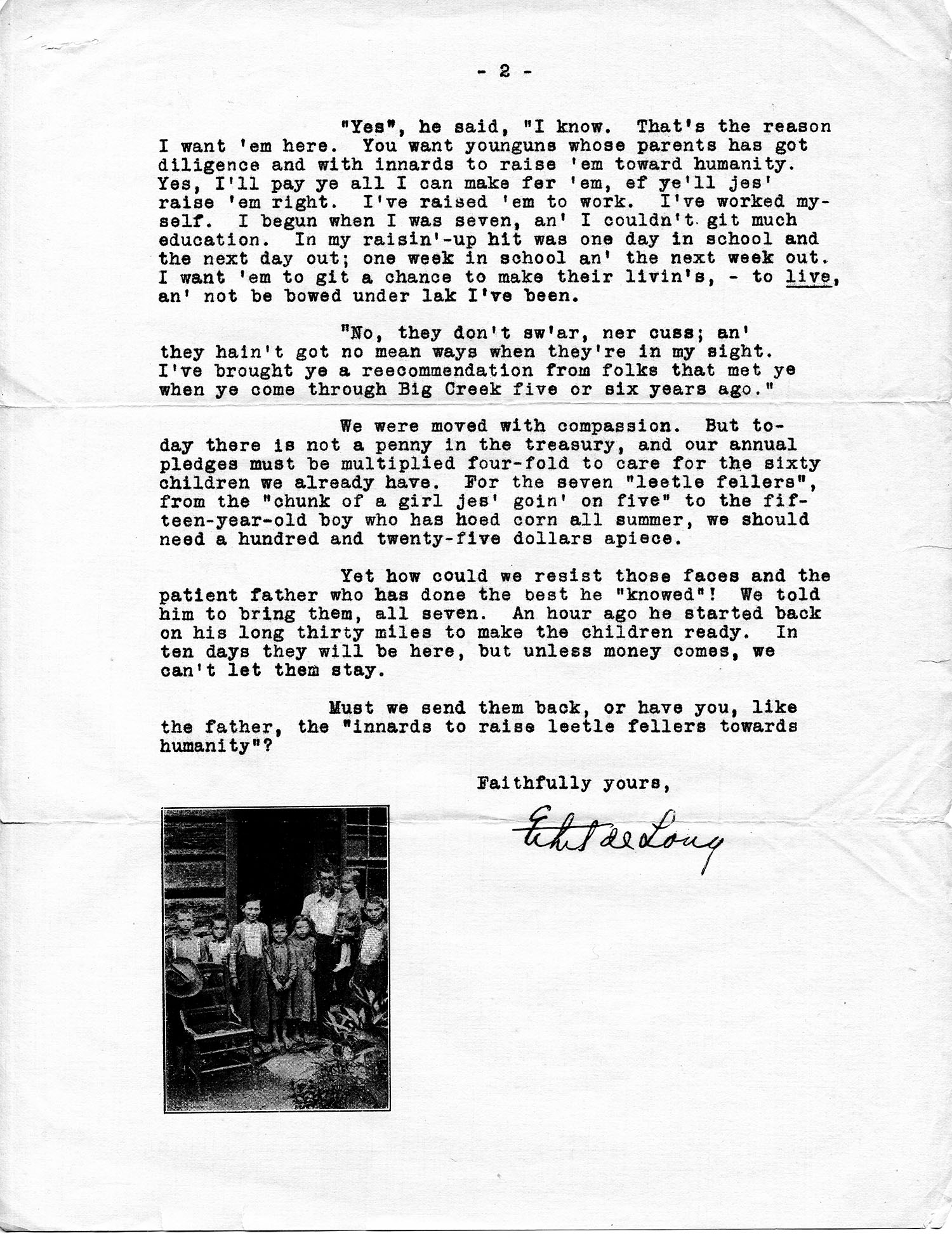 We were moved with compassion. But today there is not a penny in the treasury, and our annual pledges must be multiplied four-fold to care for the sixty children we already have. For the seven “leetle fellers”, from the “chunk of a girl jes’ goin’ on five” to the fifteen-year-old boy who has hoed corn all summer, we should need a hundred and twenty-five dollars apiece.