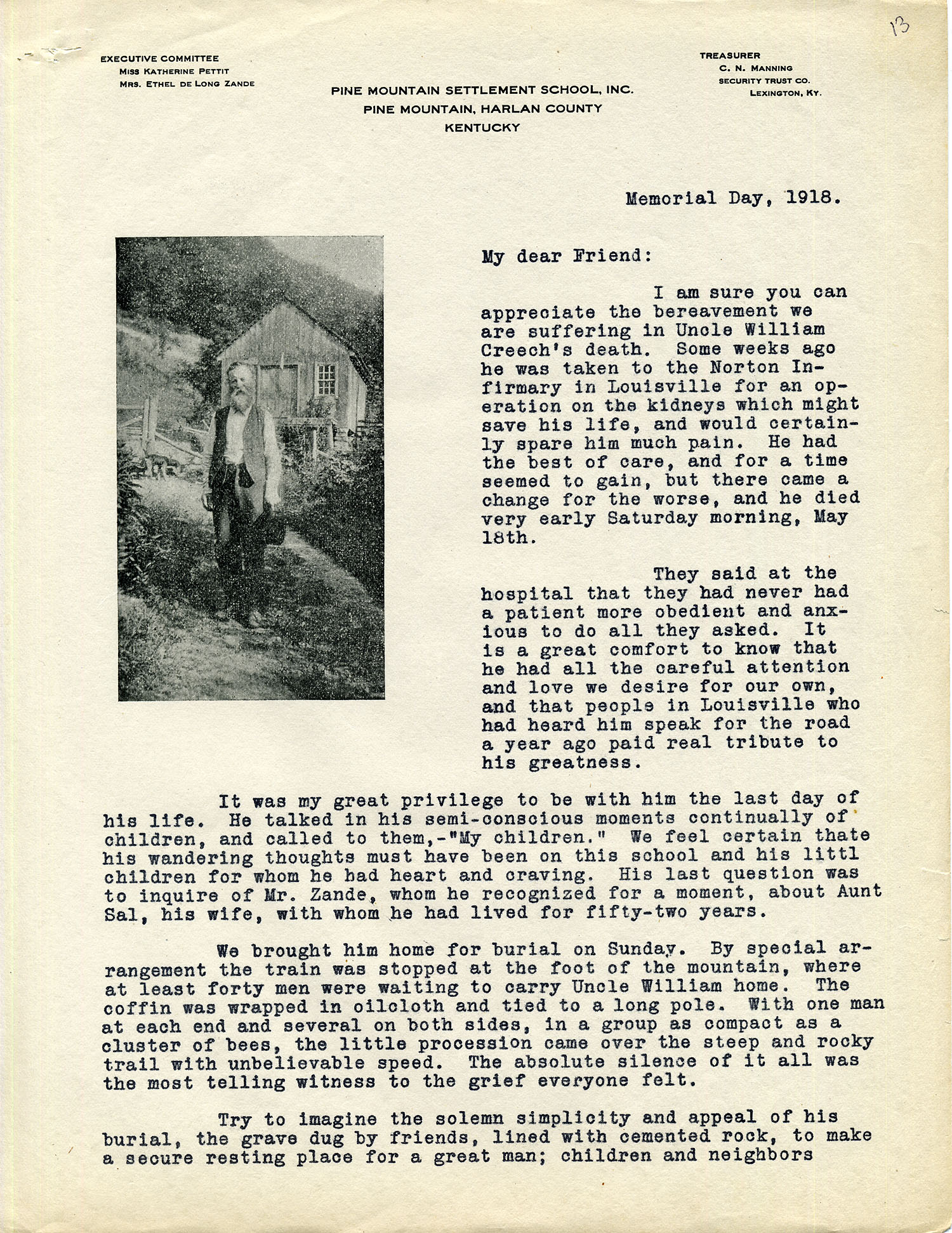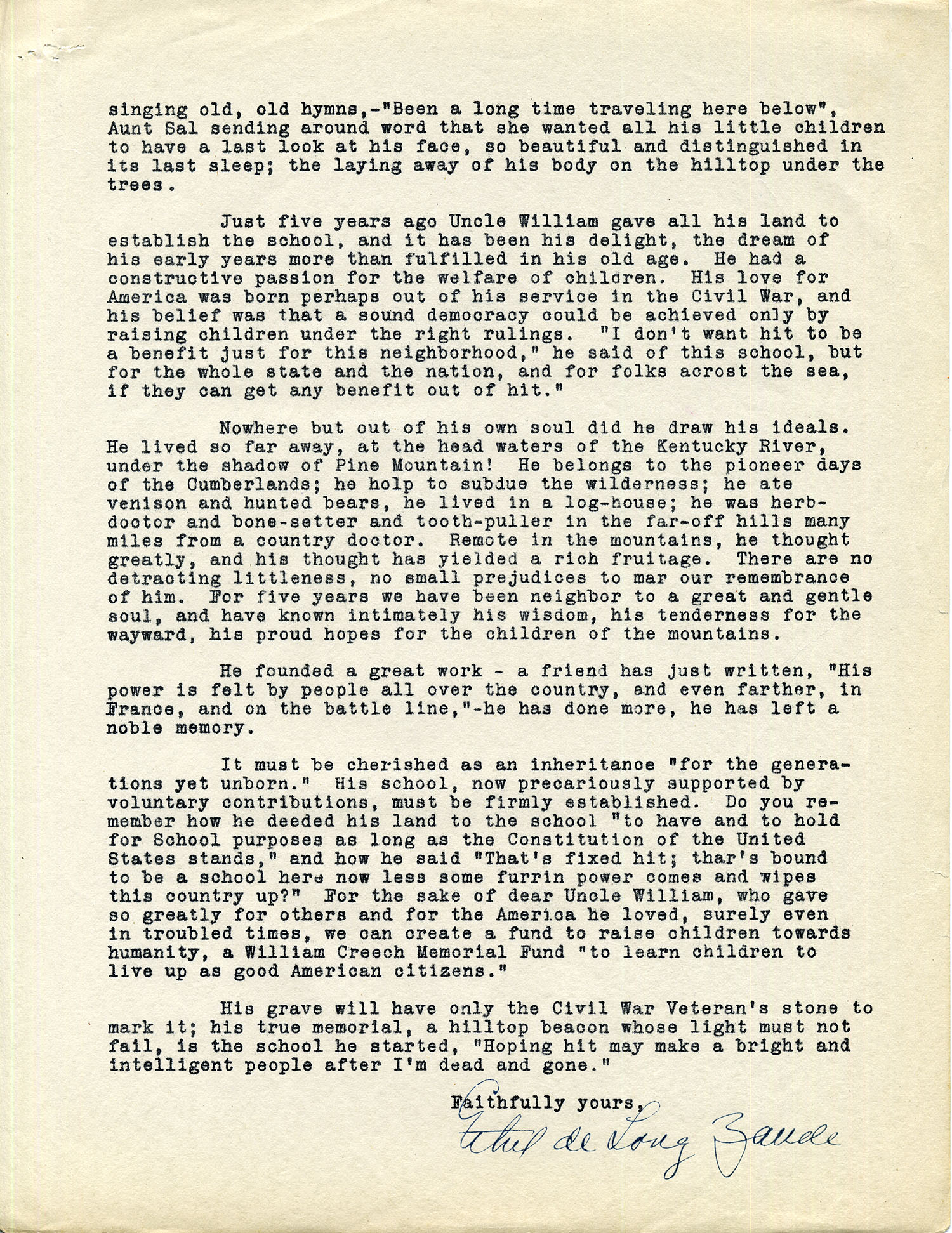 Uncle William Creech’s death on May 18 at Norton Infirmary, Louisville ; description of his last day ; description of burial ; words of tribute to William Creech ; created a fund in his name ; description of William Creech’s grave ; signed Ethel de Long Zande ;