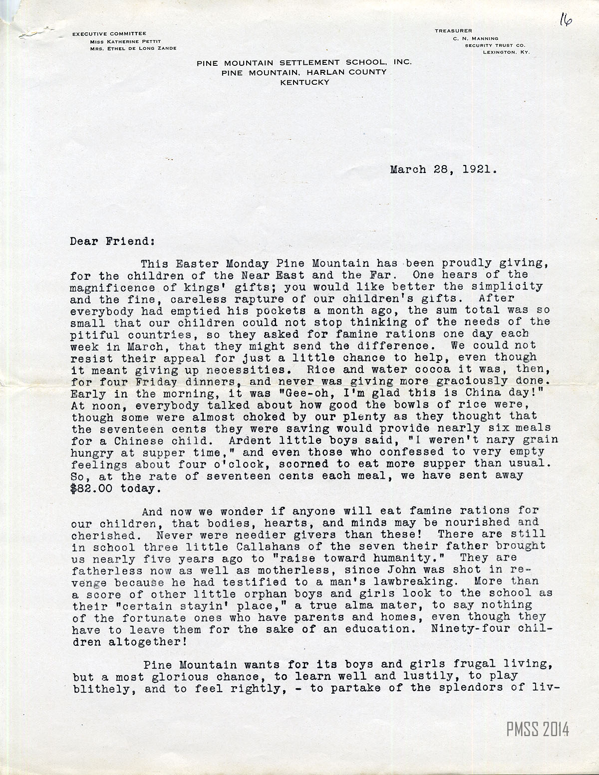Dear Friend Letters 1921 consists of one 2-page letter that includes the following subjects: Students donated money for children of “Near and Far East” ; students requested and received famine rations one day a week in March to add to their donations ; donations totaled $82.00 ; Pine Mountain students also need help ; three of the 7 Callahans are still at school ; John Callahan was victim of revenge killing ; 94 children at the School ; donations are needed for infirmary and each child ; signed by Ethel de Long Zande ;