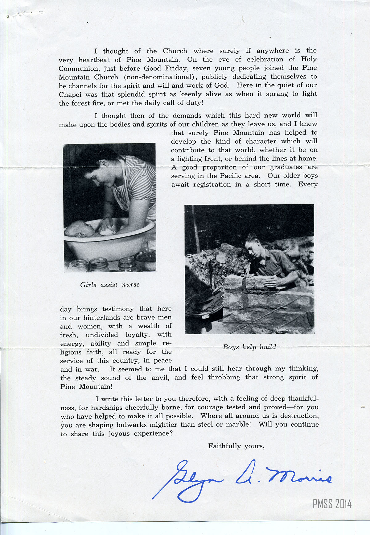 Letterhead lists names of director and treasurer ; Morris describes how the sound of the anvil in the Workshop is symbolic of PMSS spirit ; gives examples of the students’ spirit in dealing with an epidemic, working at daily chores, and attending Chapel services ; describes how the School has prepared the students to face the new world, whether at war or at home ; feels thankful for the students’ hardiness and courage and for donors ; asks for donors’ continued help ; signed by Glyn A. Morris ;