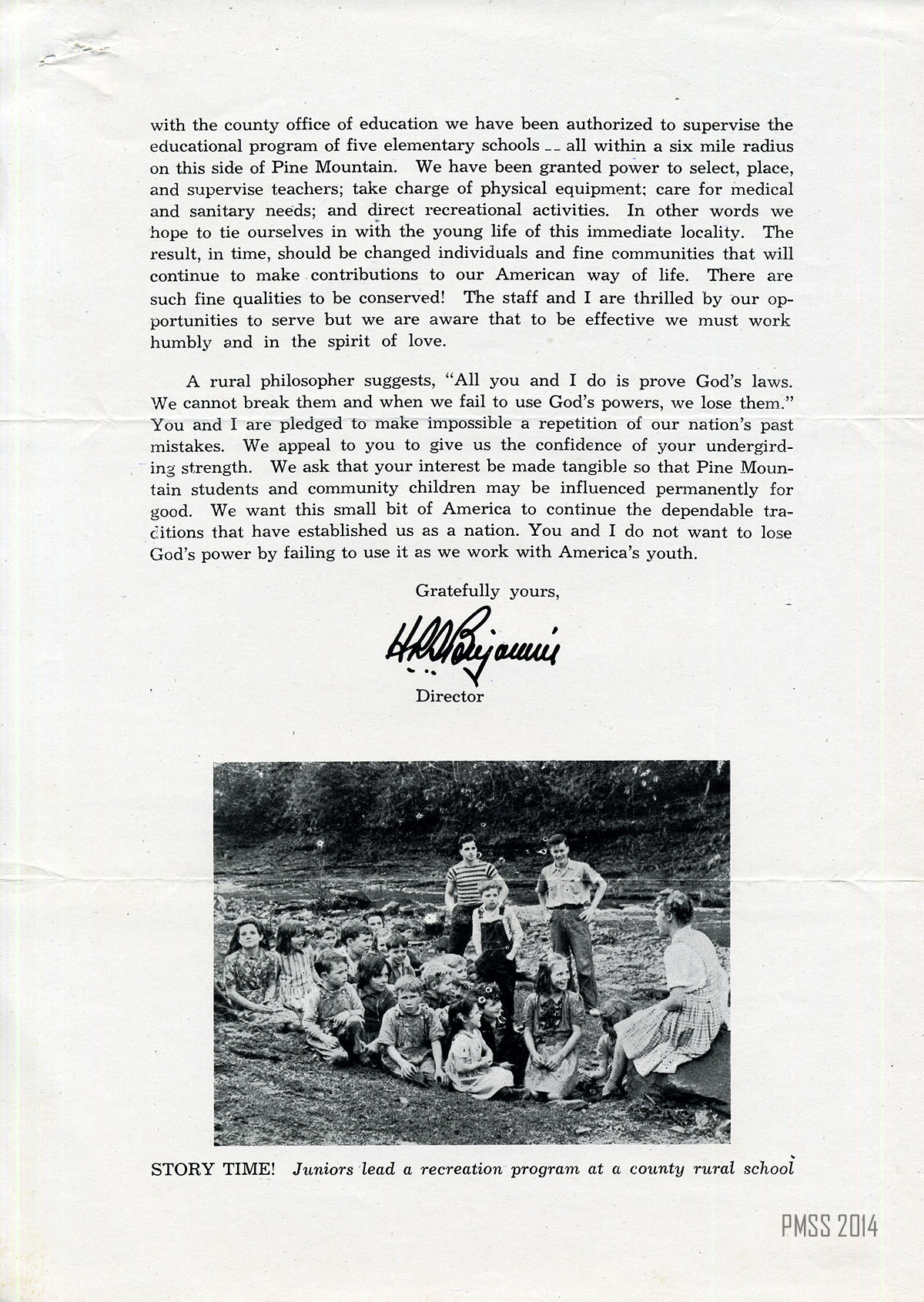 A rural philosopher suggests, “All you and I do is prove God’s laws. We cannot break them and when we fail to use God’s powers, we lose them.” You and I are pledged to make impossible a repetition of our nation’s past mistakes. We appeal to you to give us the confidence of your undergirding strength. We ask that your interest be made tangible so that Pine Mountain students and community children may be influenced permanently for good. We want this small bit of America to continue the dependable traditions that have established us as a nation. You and I do not want to lose God’s power by failing to use it as we work with America’s youth.