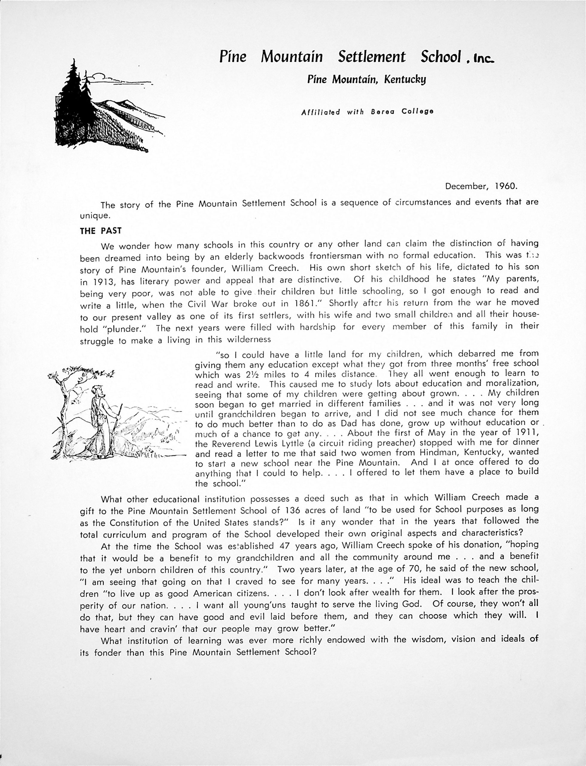 “THE PAST” PMSS Director Burton Rogers tells the story of the Pine Mountain School: Quotes from Founder William Creech about his life, concerns about educating his family and the preacher Reverend Lewis Lyttle who approached him about starting a new school, and the purpose of his donation of 136 acres of land for a school.