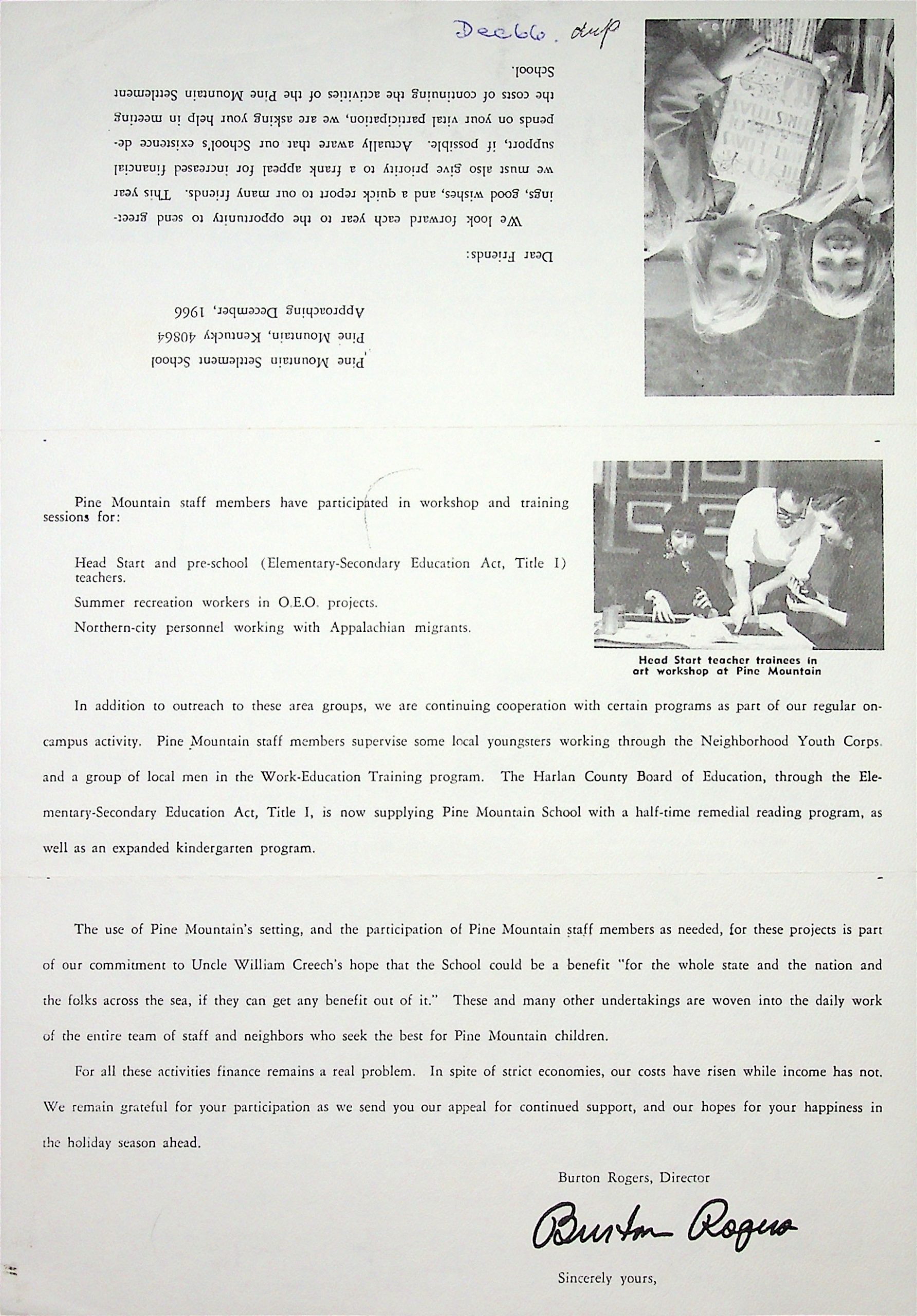 Text: Director Burton Rogers begins his letter to “Dear friends” with the photo of “this Pine Mountain space-age youngster, supporting his drawing paper on a pioneer millstone, symbolizes concurrent elements of old and new in Appalachia. National concern has centered on those parts of the ‘old’ which are outmoded, inadequate and slow to change. Pine Mountain Settlement School experiences these complex and critical realities of mountain life….” yet there is much about the young people that show promise, prompting Rogers to write this letter about “What’s new at Pine Mountain this year?”