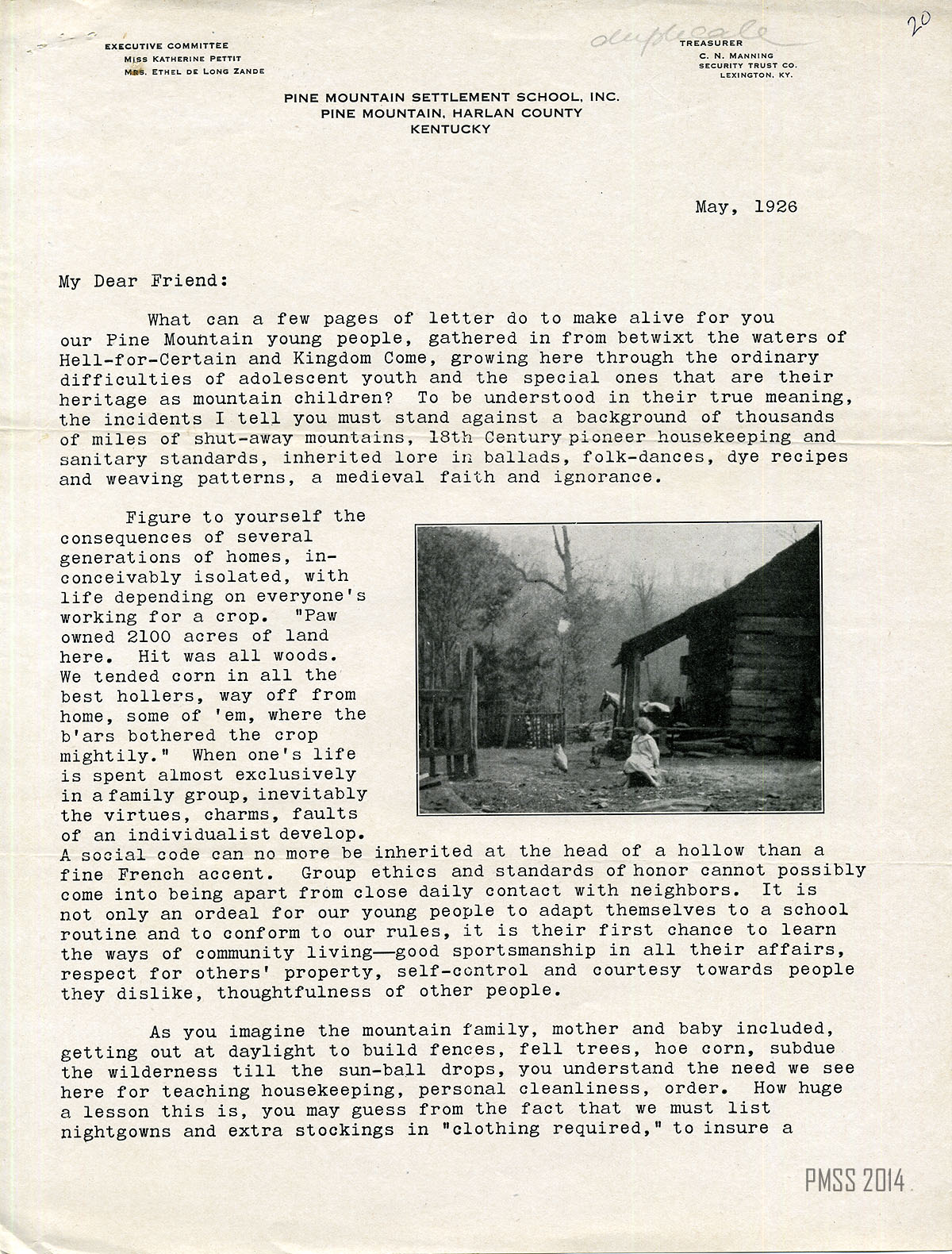 TAGS: Dear Friend Letters, May 1926, fund-raising, Dr. Warren Wilson, education of mountain youth, anecdotes about Pine Mountain young people, special difficulties as mountain children, reasons for lack of a social code, signs of improvements in students’ outlook, use of midwife and charm doctor, crop planting,