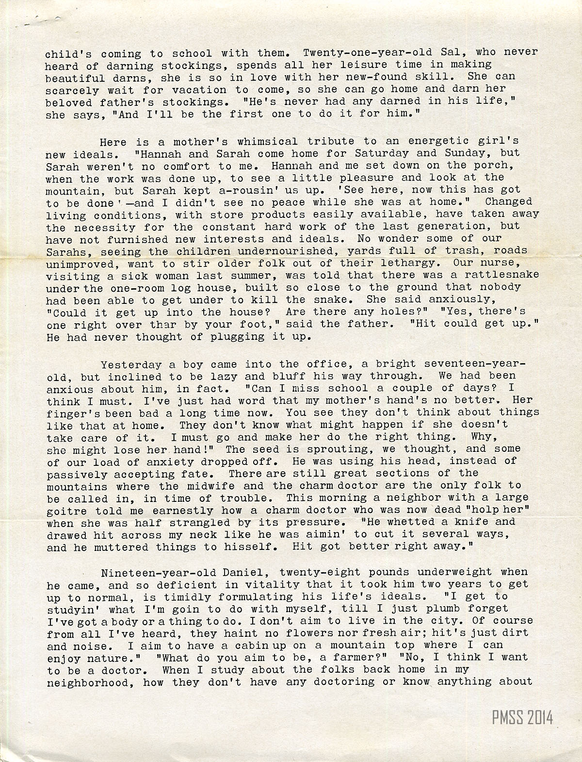 Nineteen-year-old Daniel, twenty-eight pounds underweight when he came, and so deficient in vitality that it took him two years to get up to normal, is timidly formulating his life’s ideals. “I get to studyin’ what I’m goin’ to do with myself, till I just plumb forget I’ve got a body or a thing to do. I don’t aim to live in the city. Of course from all I’ve heard, they haint no flowers nor fresh air; hit’s just dirt and noise. I aim to have a cabin up on a mountain top where I can enjoy nature.” “What do you aim to be, a farmer?” “No, I think I want to be a doctor. when I study about the folks back home in my neighborhood, how they don’t have any doctoring or know anything about…