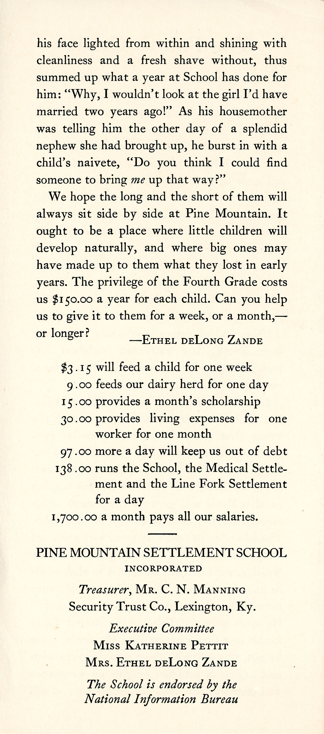 TAGS: Ethel de Long Zande writing 1928, fourth grade at PMSS, Martha Callahan, Katherine Pettit, education, fundraising, promotional literature, Charles N. Manning, National Information Bureau