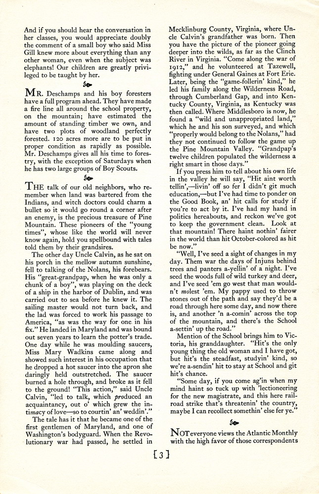…whose letters so frequently appear in the Contributor’s Column. A small boy who had had to dust the living room table morning after morning had drawn up his own notions of that periodical and was quite surprised to be interested by the story “Pioneers” when it was read to a group of children one night. “Why, that book is some ‘count, haint hit? I’ve studied’ bout th’owin’ hit away a heap o’ times, when I’ve seed hit a-layin’ on the table, ’cause hit never had no pictures, but hit’s some ‘count after all, haint hit?”