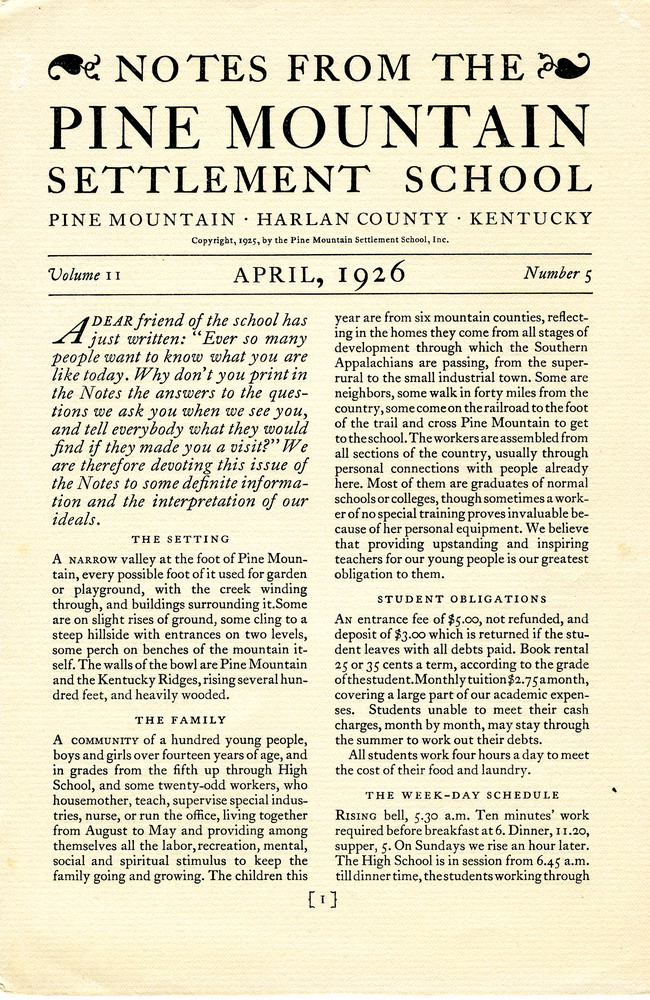 A NARROW valley at the foot of Pine Mountain, every possible foot of it used for garden or playground, with the creek winding through, and buildings surrounding it. Some are on slight rises of ground, some cling to a steep hillside with entrances on two levels, some perch on benches of mountain itself. The walls of the bowl are Pine Mountain and the Kentucky Ridges, rising several hundred feet, and heavily wooded.