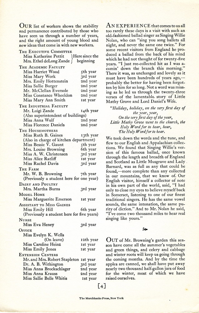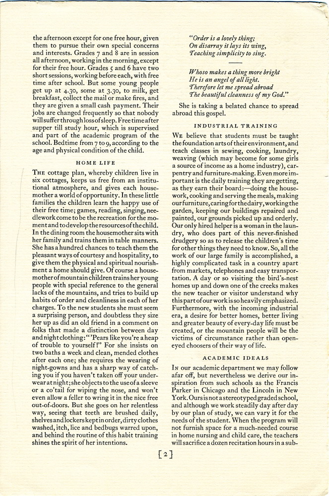 …subject less important for these girls, and of course they cheerfully put in extra time with a handful of pupils who need special help in college preparatory subjects. The individuality of each child is worth while. The claims of those who wish to take their last year at Berea or Lincoln Memorial [University] and will find use for all the credits they make here are no more interesting to us than those of a seventeen-year-old girl who will probably marry within a year, and we decide with care in what class she will get the best that she can take. The school atmosphere is living. Classes and assembly periods are used for the development of the children’s initiative. The teachers infuse with life the local occupations of the school and community. Friends have seen to it that we have excellent supplementary material, in the books in our library and living rooms. We try never to economize by continuing to use a dull or antiquated text-book when we have found an inspired one. To provide the mental tools for everyday needs and to make our young people alert, open-minded, and full of zest for enlarging their horizons, is our aim.