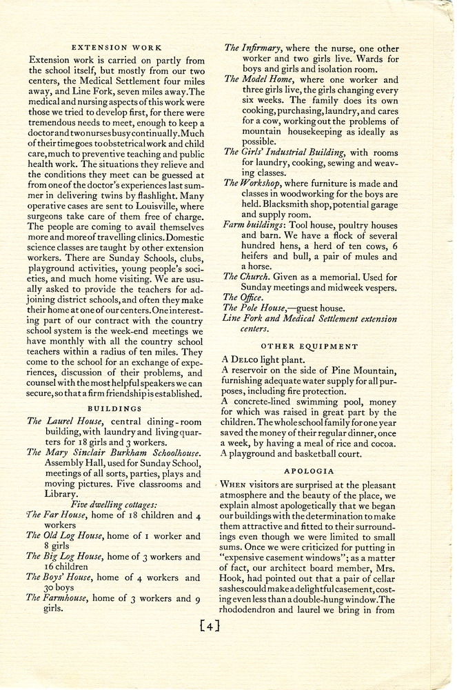 TAGS: NOTES – 1926 APRIL: campus description, Native Americans, students, workers, fees, schedule, cottage plan, housemother, poem, work program, industrial training, academic ideals, Frances Parker School, Lincoln Memorial School, culture, recreation, swimming pool, religion, nursing, buildings, extension work, Medical Settlement, Line Fork, equipment, economizing, budget, Mr. Zeigler, Mrs. Hook, Elizabeth Hench, Mrs. James J. Storrow, Harriot Houghteling, Cloyd McAllister, Dr. Francis Sage Bradley