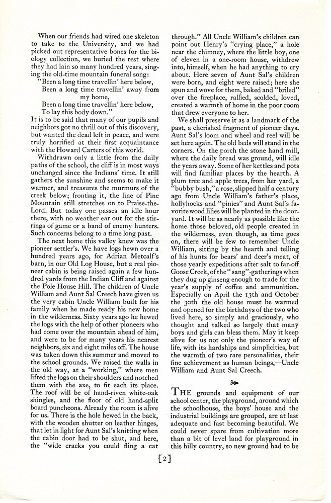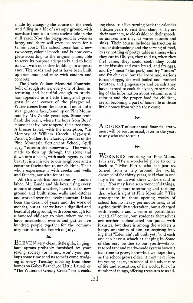 WORKERS returning to Pine Mountain say, “It’s a wonderful place to come back to!” Miss [Katherine] Pettit, who has just returned from a trip around the world, dreamed of for thirty years, said that in one day after her arrival three workers said to her, “You may have seen wonderful things, but nothing more interesting and thrilling than what is right at Pine Mountain.” The atmosphere in these opening weeks of school has no heavy perfunctoriness, as of a grind dutifully undertaken, but is charged with freedom and a sense of possibilities ahead. Of course, our students themselves are neither sophisticated nor jaded with luxuries, but there is among the workers a happy unanimity of aim, an inspiring feeling that “Eden ain’t all built yet,” and each one can have a whack at shaping it. Some of this may be due to our youth — elaborate red tape and ready-made system haven’t had time to grow, here — but we hope that, as the school grows older, it may never lose its young heart, its sense of the adventure of life and education, of the world, full of a number of things, offering treasures to us all.