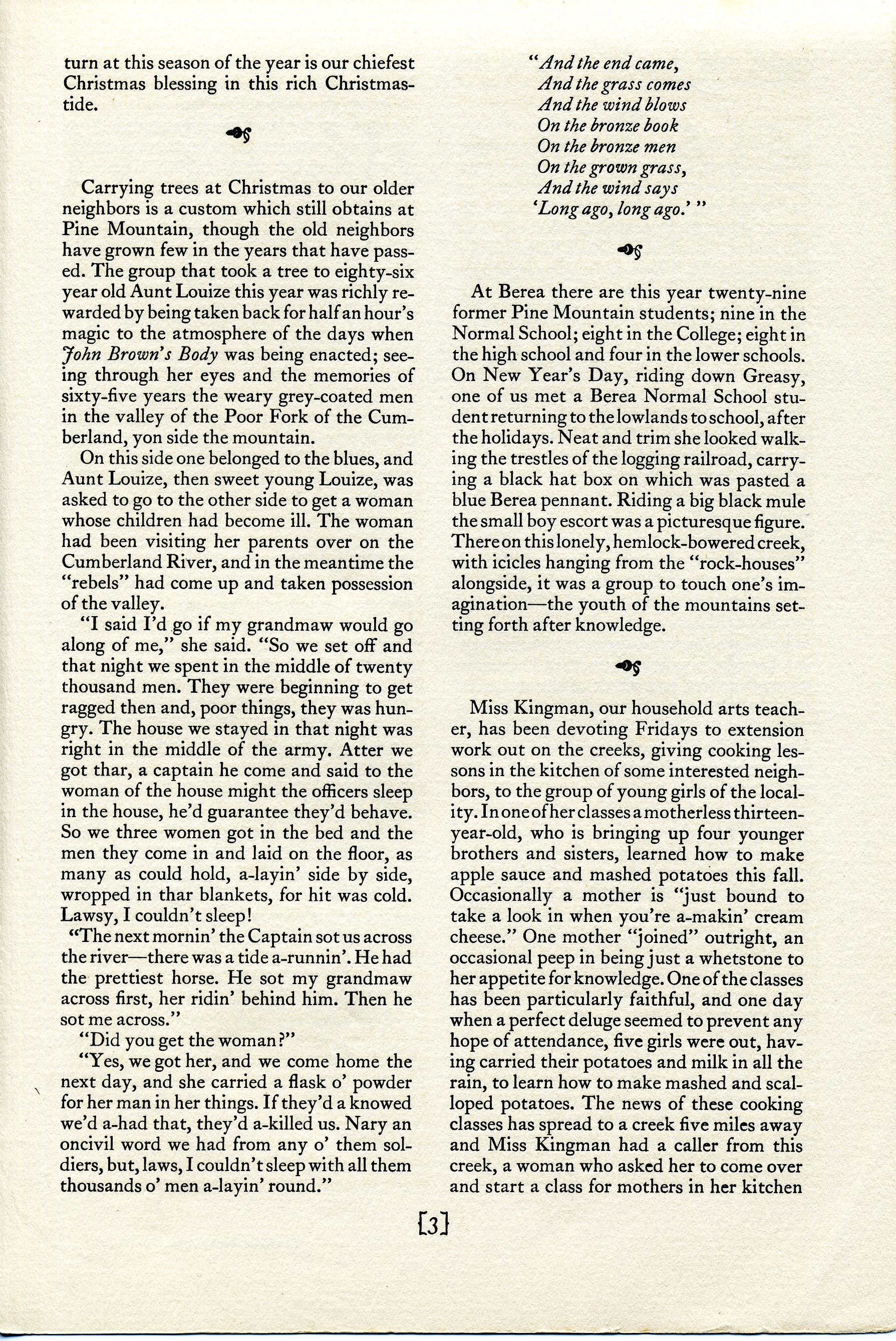 Carrying trees at Christmas to our older neighbors is a custom which still obtains at Pine Mountain, though the old neighbors have grown few in the years that have passed. The group that took a tree to eighty-six year old Aunt Louize this year was richly rewarded by being taken back for half an hour’s magic to the atmosphere of the days when John Brown’s Body was being enacted; seeing through her eyes and the memories of sixty-five years the weary grey-coated men in the valley of the Poor Fork of the Cumberland, yon side the mountain.