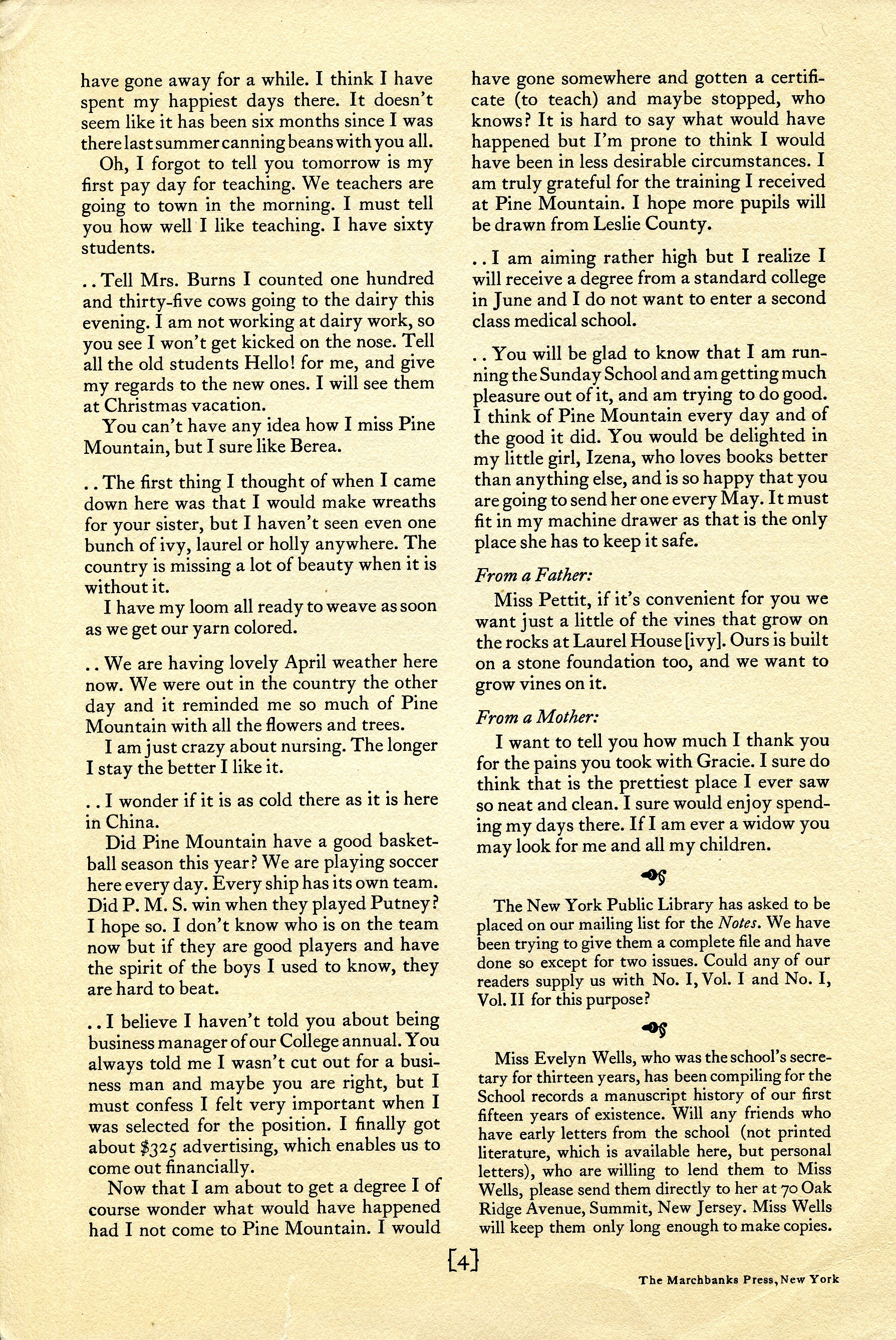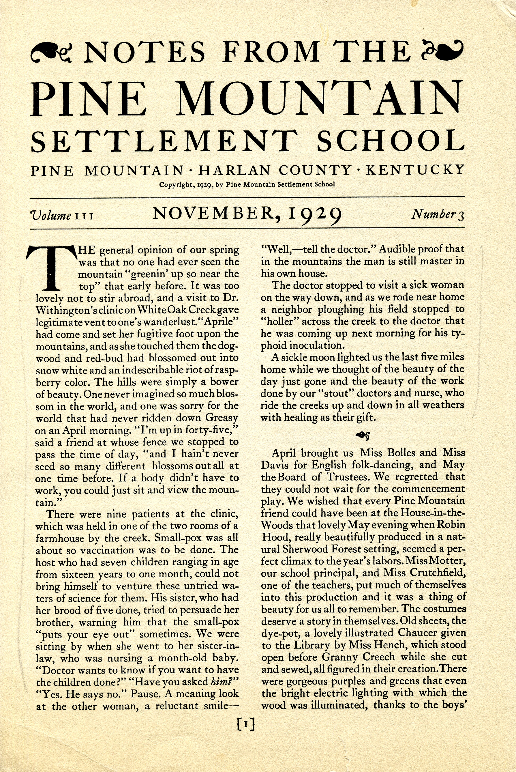 TAGS: NOTES – 1929 NOVEMBER: Dr. Alfreda Withington‘s clinic, smallpox, Dorothy Bolles, Mary Gould Davis, commencement play, flood, burning of Line Fork building, summer school, Mrs. Greenacre, children’s newspaper, Pine Mountain Echo, student poem, Electricity Trust Fund, Diesel engine vs. line over mountain, summer school, Fair Day, Governor visit, Dr. White, dental clinic, Gladys Hill, Miss Marguerite Emerson, Ruth B. Gaines, Mrs. Martha Burns, NY Public Library, Evelyn K. Wells, letters from alumni