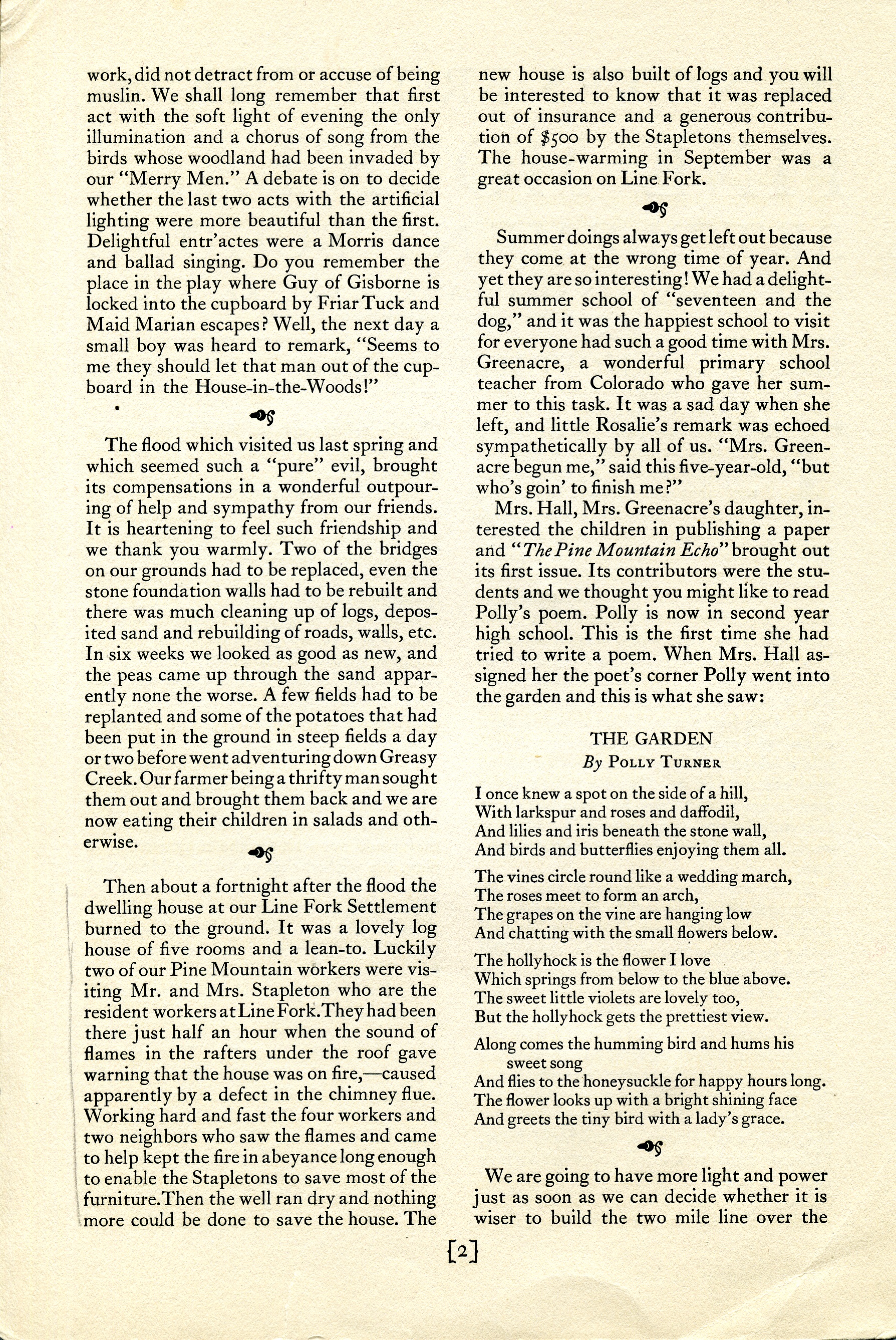 Mrs. Hall, Mrs. Greenacre’s daughter, interested the children in publishing a paper and “The Pine Mountain Echo” brought out its first issue. Its contributors were the students and we thought you might like to read Polly‘s poem. Polly is now in second year high school. This is the first time she had tried to write a poem. When Mrs. Hall assigned her the poet’s corner Polly went into the garden and this is what she saw: