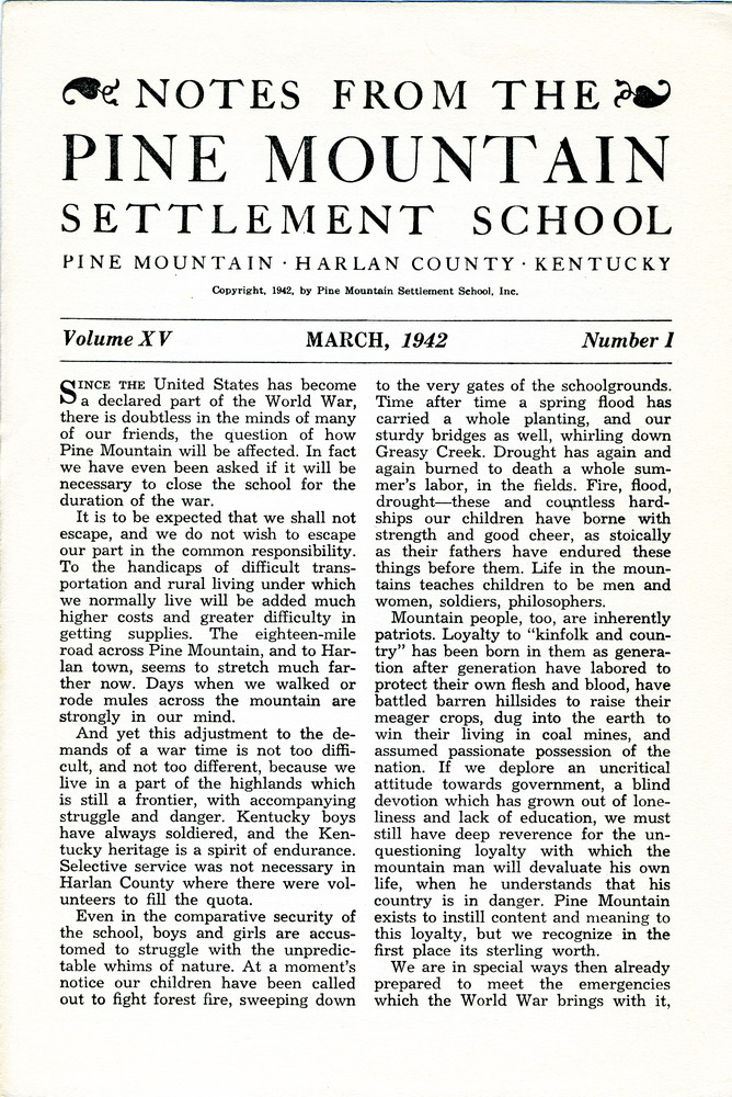 Mountain people, too, are inherently patriots. Loyalty to “kinfolk and country” has been born in them as generation after generation have labored to protect their own flesh and blood, have battled barren hillsides to raise their meager crops, dug into the earth to win their living in coal mines, and assumed passionate possession of the nation. If we deplore an uncritical attitude towards government, a blind devotion which has grown out of loneliness and lack of education, we must still have deep reverence for the unquestioning loyalty with which the mountain man will devaluate his own life, when he understands that his country is in danger. Pine Mountain exists to instill content and meaning to this loyalty, but we recognize in the first place its sterling worth.