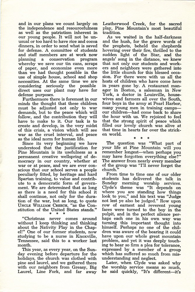 Since its very beginning we have understood that the justification for Pine Mountain is its usefulness as a permanent creative wellspring of democracy in our country, whether at war or at peace, and we are ever conscious that our school serves a people peculiarly fitted, by heritage and hard Spartan training, to value and contribute to a democratic form of government. We are determined that as long as there is a need for this school it shall continue, not only for the duration of the war, but as long, to quote UNCLE WILLIAM CREECH, “as the Constitution of the United States stands.“