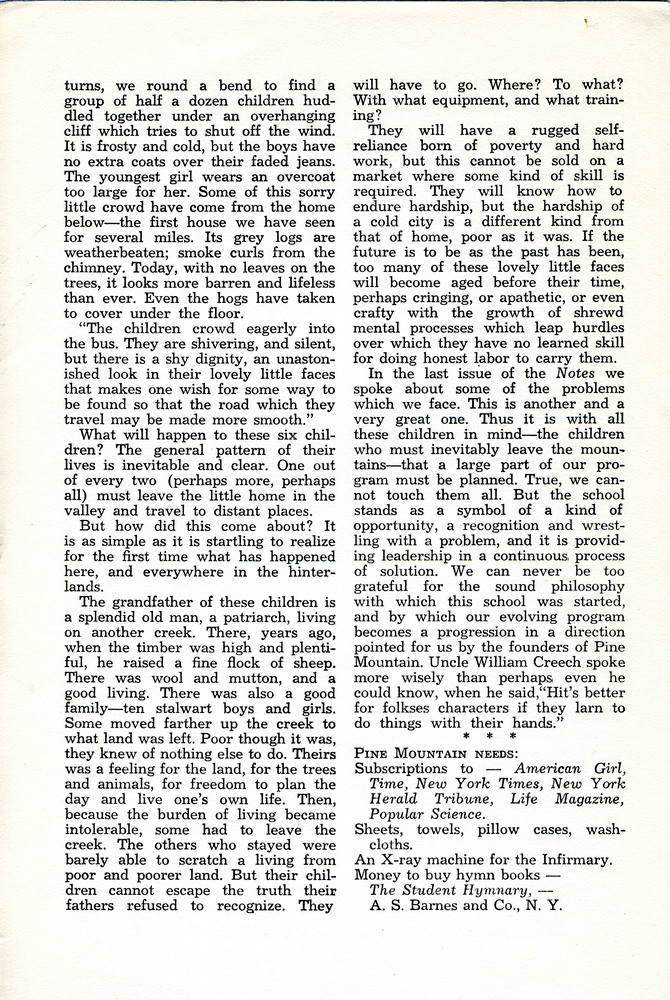 We should like you to share the experience of one of our staff members, who describes a trip with the Pine Mountain school bus over the narrow winding road it follows daily, down Laurel Creek. He writes, “Turning sharply away from Pine Mountain at the breaks of Laurel, the road winds high above the creek, yet far down from the top of the mountain. Down, and farther down it winds, around sharp curves, underneath jutting cliffs and precariously balanced rocks, past rhododendron thickets and towering trees, always with the valley and the creek sharp below. Finally, after many…