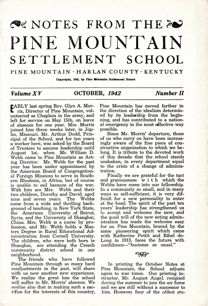 EARLY last spring Rev. Glyn A. Morris, Director of Pine Mountain, volunteered as Chaplain in the army, and left for service on May 15th, on leave of absence for one year. Mrs. Morris joined him three weeks later, in Joplin, Missouri. Mr. Arthur Dodd, Principal of the School, and for ten years a worker here, was asked by the Board of Trustees to assume leadership until August 1st, when Mr. William D. Webb came to Pine Mountain as Acting Director. Mr. Webb for the past year has been under appointment by the American Board of Congregational Foreign Missions to serve in Southern Rhodesia, in Africa, but of course is unable to sail because of the war. With him are Mrs. Webb and their two children, Dorothy and David, aged nine and seven years. The Webbs come from a wide and thrilling background of teaching, in New York State, the American University of Beirut, Syria, and the University of Shanghai, China. Mrs. Webb is a nurse by profession, and Mr. Webb holds a Masters Degree in Rural Educational Administration from Cornell University. The children, who were both born in Shanghai, are attending the Creech community district school in our neighborhood.