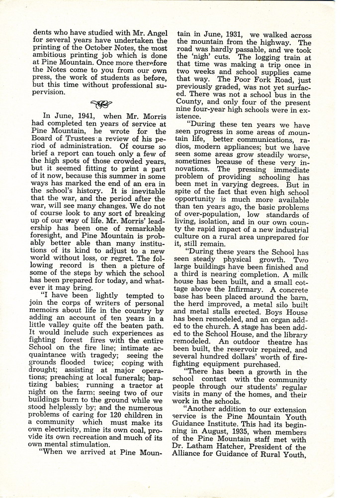 In June, 1941, when Mr. Morris had completed ten years of service at Pine Mountain, he wrote for the Board of Trustees a review of his period of administration. Of course so brief a report can touch only a few of the high spots of those crowded years, but it seemed fitting to print a part of it now, because this summer in some ways has marked the end of an era in the school’s history. It is inevitable that the war, and the period after the war, will see many changes. We do not of course look to any sort of breaking up of our way of life. Mr. Morris’ leadership has been one of remarkable foresight, and Pine Mountain is probably better able than many institutions of its kind to adjust to a new world without loss, or regret. The following record is then a picture of some of the steps by which the school has been prepared for today, and whatever it may bring.