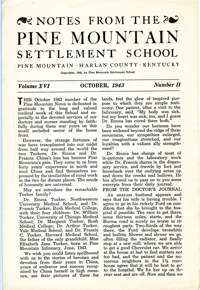 However, the strange fortunes of war have transplanted into our midst from half way around the world the two Tuckers, Dr. Emma and Dr. Francis. China’s loss has become Pine Mountain’s gain. They come to us from forty years’ experience in north and west China and find themselves impressed by the similarities of rural work in the two far distant places. The needs of humanity are universal.