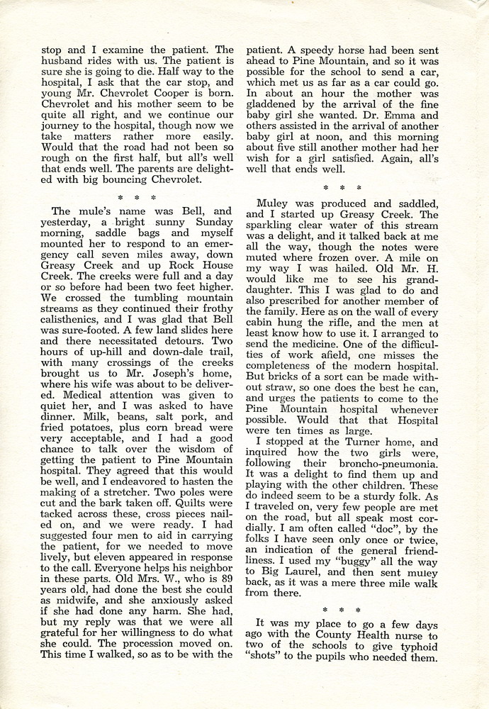 The mule’s name was Bell, and yesterday, a bright sunny Sunday morning, saddle bags and myself mounted her to respond to an emergency call seven miles away, down Greasy Creek and up Rock House Creek. The creeks were full and a day or so before had been two feet higher. We crossed the tumbling mountain streams as they continued their frothy calisthenics, and I was glad that Bell was sure-footed. A few land slides here and there necessitated detours. Two hours of up-hill and down-dale trail, with many crossings of the creeks brought us to Mr. Joseph’s home, where his wife was about to be delivered. Medical attention was given to quiet her, and I was asked to have dinner. Milk, beans, salt pork, and fried potatoes, plus corn bread were very acceptable, and I had a good chance to talk over the wisdom of getting the patient to Pine Mountain hospital. They agreed that this would be well, and I endeavored to hasten the making of a stretcher. Two poles were cut and the bark taken off. Quilts were tacked across these, cross pieces nailed on, and we were ready. I had suggested four men to aid in carrying the patient, for we needed to move lively, but eleven appeared in response to the call. Everyone helps his neighbor in these parts. Old Mrs. W., who is 89 years old, had done the best she could as midwife, and she anxiously asked if she had done any harm. She had, but my reply was that we were all grateful for her willingness to do what she could. The procession moved on. This time I walked, so as to be with the patient. A speedy horse had been sent ahead to Pine Mountain, and so it was possible for the school to send a car, which met us as far as a car could go. In about an hour the mother was gladdened by the arrival of the fine baby girl she wanted. Dr. Emma and others assisted in the arrival of another baby girl at noon, and this morning about five still another mother had her wish for a girl satisfied. Again, all’s well that ends well.