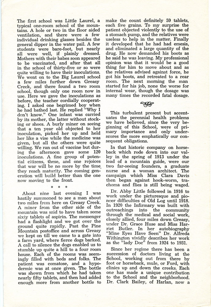Since her regime there has been a succession of doctors living at the School, working out from there by foot or horseback, mule, or Ford, with clinics up and down the creeks. Each one has made a unique contribution to the School and the neighborhood. Dr. Clark Bailey, of Harlan, now a…