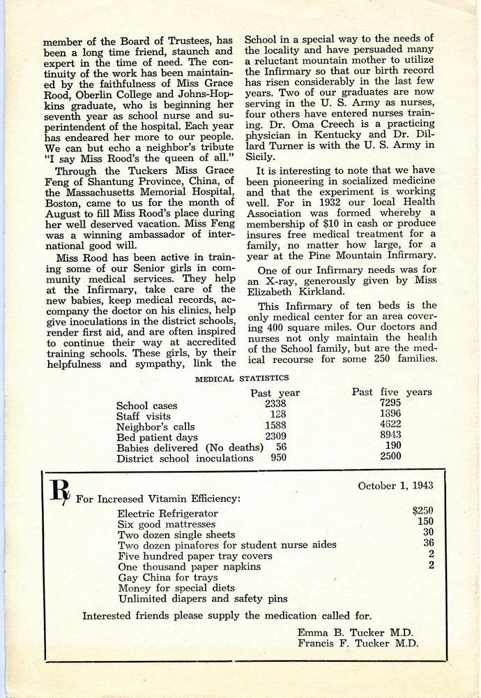 TAGS: NOTES – 1943 OCTOBER: doctors, Greasy Creek, Rock House Creek, medicine, Dr. Emma Tucker, Dr. Francis Tucker, Dr. Margaret Tucker, Glyn A. Morris, Dr. Arthur Tucker, Elizabeth Jane Tucker, Grace Feng, Grace Rood, Dr. Oma Creech, Elizabeth Kirkland, medical service, Clara Davis, Dr. Abby Little, Infirmary, Dr. Grace Huse, Harriet Butler, Dr. Alfreda Withington, Dr. Clark Bailey, Dr. Dillard Turner, socialized medicine, Health Association