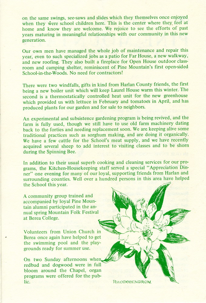 TAGS: NOTES – 1975 June, Environmental Program, special weekends, playgrounds, community, building maintenance, gardens, gifts in kind, greenhouses, farm, sorghum, cattle, sheep, Spinning Bee, Appreciation Dinner, Mountain Folk Festival, Union Church, swimming pool, Chapel, Mountain Medicine Workshop, Ellwood J. Carr, Homecoming, Fall Color Weekend, College Winter Term in ecology, Rev. Alvin Boggs
