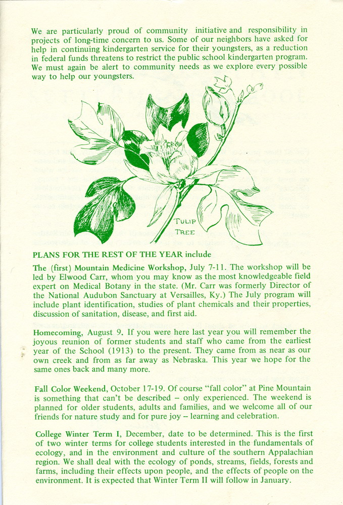 The (first) Mountain Medicine Workshop, July 7-11. The workshop will be led by Elwood Carr, whom you may know as the most knowledgeable field expert on Medical Botany in the state. (Mr. Carr was formerly Director of the National Audubon Sanctuary at Versailles, Ky.) The July program will include plant identification, studies of plant chemicals and their properties, discussion of sanitation, disease, and first aid.