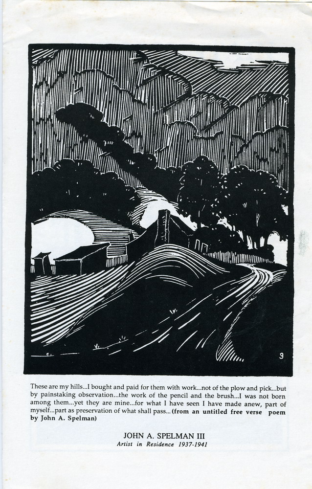 These are my hills….I bought and paid for them with work…not of the plow and pick…but by painstaking observation…the work of the pencil and the brush…I was not born among them…yet they are mine…for what I have seen I have made anew, part of myself…part as preservation of what shall pass… (from an untitled free verse poem by John A. Spelman)