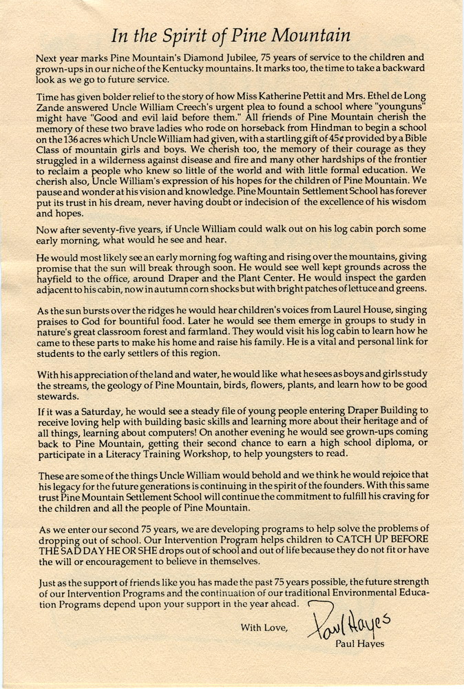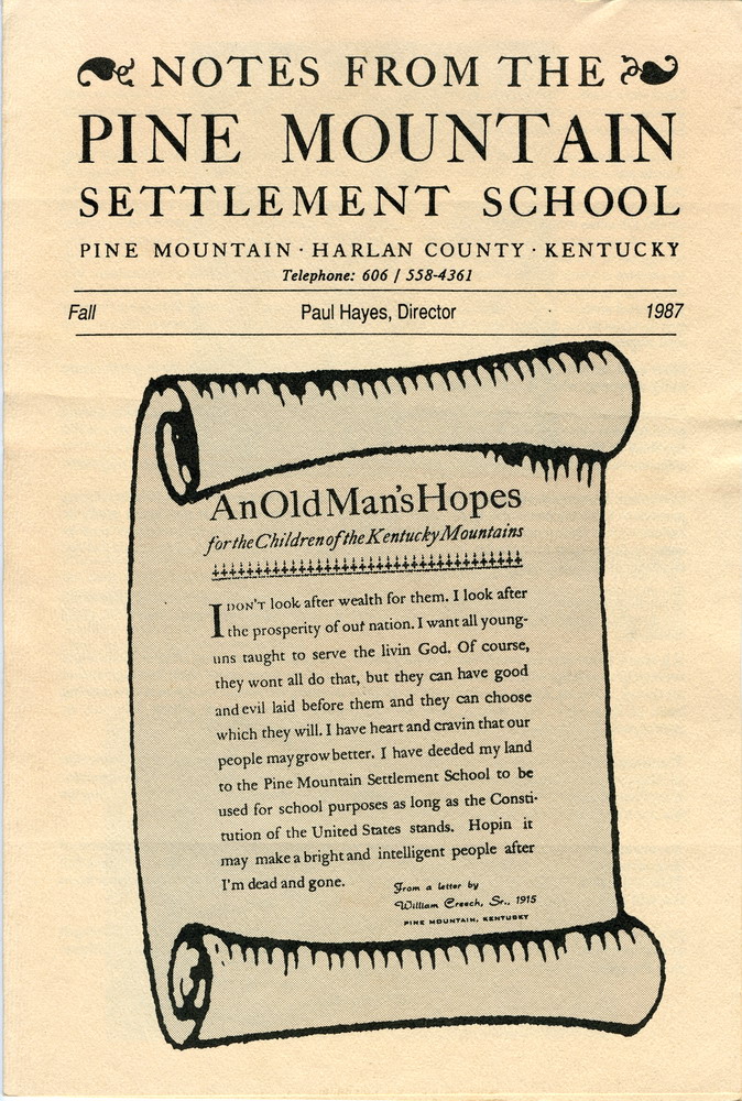 Time has given bolder relief to the story of how Miss Katherine Pettit and Mrs. Ethel de Long Zande answered Uncle William Creech’s urgent plea to found a school where “younguns” might have “Good and evil laid before them.” All friends of Pine Mountain cherish the memory of these two brave ladies who rode on horseback from Hindman to begin a school on the 136 acres which Uncle William had given, with a startling gift of 45¢ provided by a Bible Class of mountain girls and boys. We cherish too, the memory of their courage as they struggled in a wilderness against disease and fire and many other hardships of the frontier to reclaim a people who knew so little of the world and with little formal education. We cherish also, Uncle William’s expression of his hopes for the children of Pine Mountain. We pause and wonder at his vision and knowledge. Pine Mountain Settlement School has forever put its trust in his dream, never having doubt or indecision of the excellence of his wisdom and hopes.