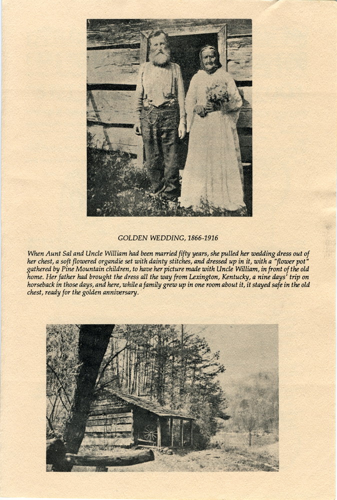 When Aunt Sal and Uncle William had been married fifty years, she pulled her wedding dress out of her chest, a soft flowered organdie set with dainty stitches, and dressed up in it, with a “flower pot” gathered by Pine Mountain children, to have her picture made with Uncle William, in front of the old home. Her father had brought the dress all the way from Lexington, Kentucky, a nine days’ trip on horseback in those days, and here, while a family grew up in one room about it, it stayed safe in the old chest, ready for the golden anniversary.