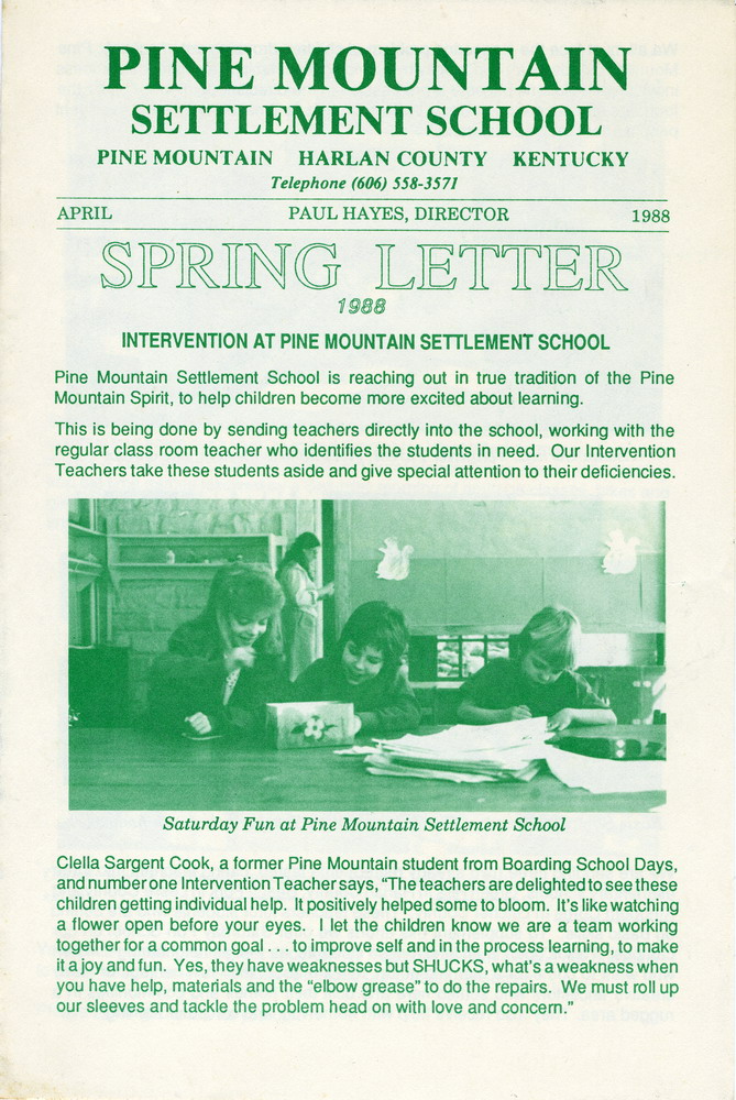 Clella Sargent (sic) Cook, a former Pine Mountain student from Boarding School Days, and number one Intervention Teacher, says, “The teachers are delighted to see these children getting individual help. It positively helped some to bloom. It’s like watching a flower open before your eyes. I let the children know we are a team working together for a common goal… to improve self and in the process learning, to make it a joy and fun. Yes, they have weaknesses but SHUCKS, what’s a weakness when you have help, materials, and the “elbow grease” to do the repairs. We must roll up our sleeves and tackle the problem head-on with love and concern.”