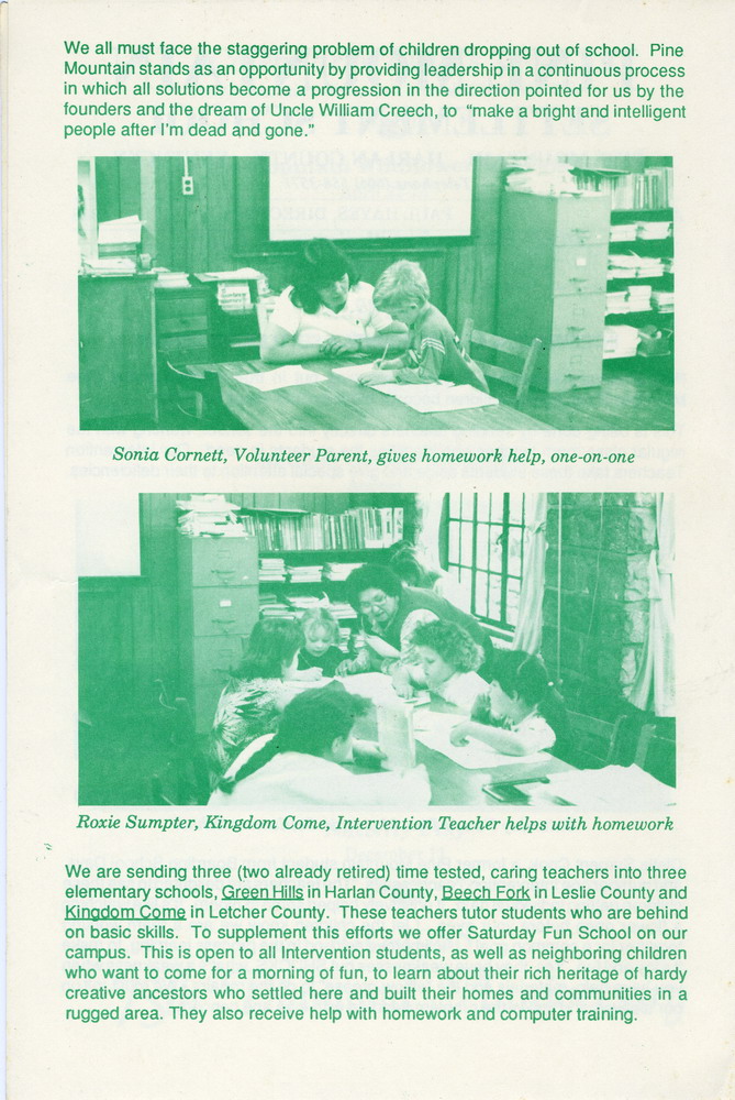 We all must face the staggering problem of children dropping out of school. Pine Mountain stands as an opportunity by providing leadership in a continuous process in which all solutions become a progression in the direction pointed for us by the founders and the dream of Uncle William Creech, to “make a bright and intelligent people after I’m dead and gone.”