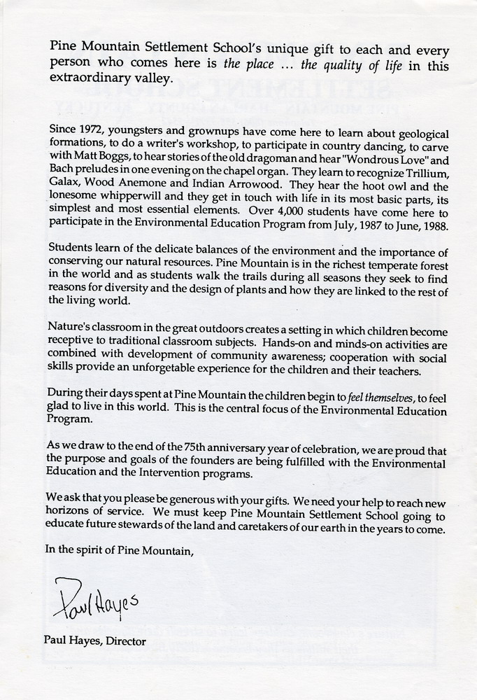 We ask that you please be generous with your gifts. We need your help to reach new horizons of service. We must keep Pine Mountain Settlement School going to educate future stewards of the land and caretakers of our earth in the years to come.
