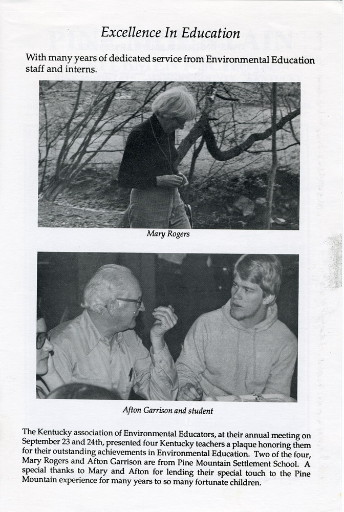 The Kentucky Association of Environmental Educators, at their annual meeting on September 23 and 24th, presented four Kentucky teachers with a plaque honoring them for their outstanding achievements in Environmental Education. Two of the four, Mary Rogers and Afton Garrison, are from Pine Mountain Settlement School. A special thanks to Mary and Afton for lending their special touch to the Pine Mountain experience for many years to so many fortunate children.