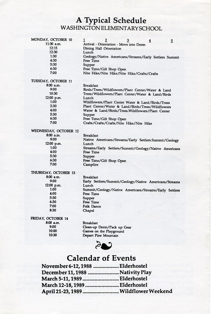 TAGS: NOTES – 1988 November, Matt Boggs, storytelling, Chapel, organ, workshops, dancing, botany, environmental education, Intervention, Mary Rogers, Afton Garrison, awards, school group schedule, photographs