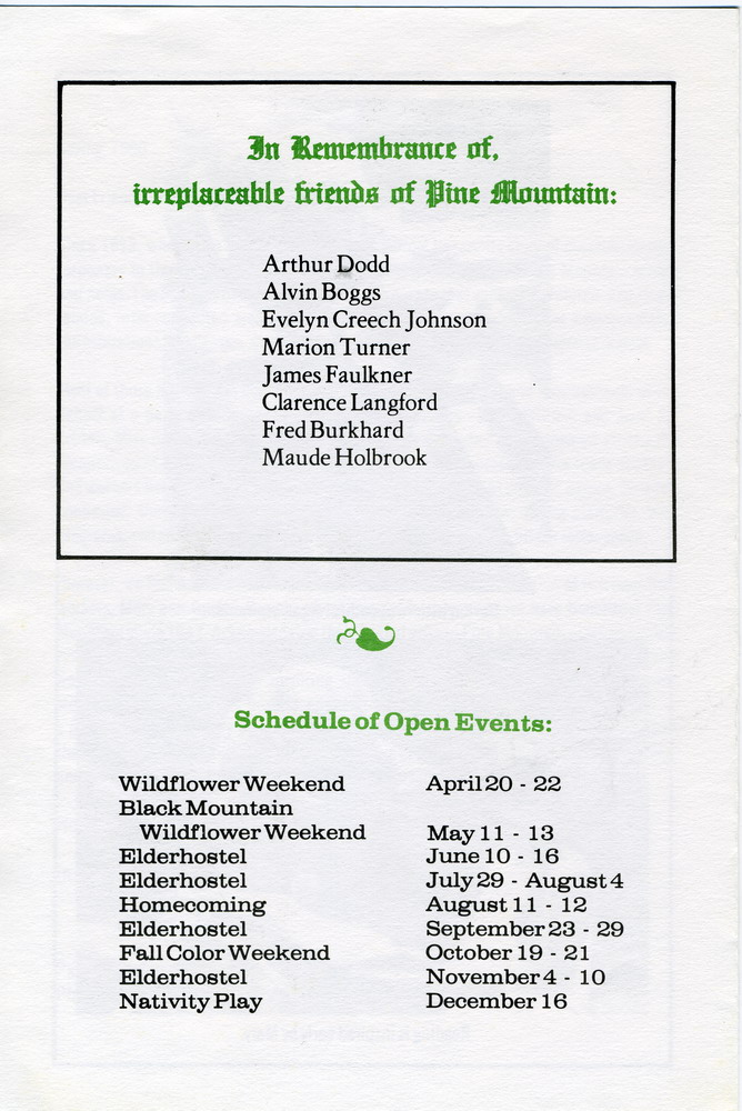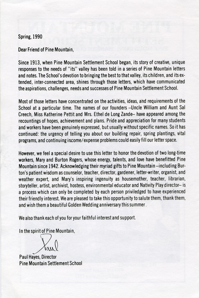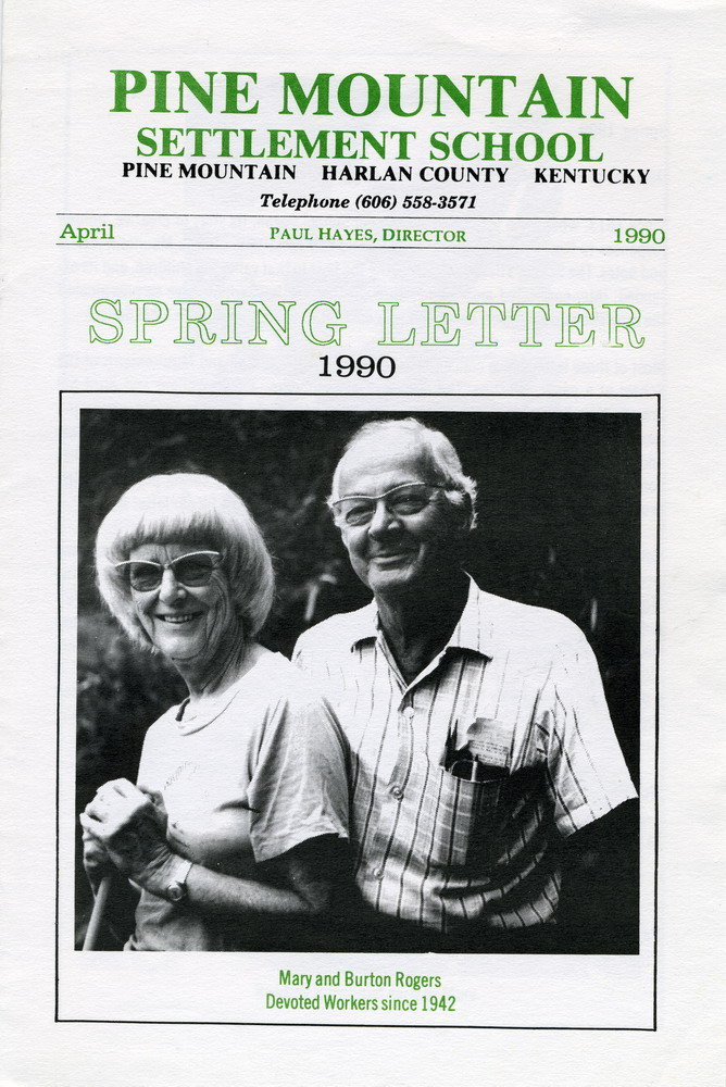…[W]e feel a special desire to use this letter to honor the devotion of two long-time workers, Mary and Burton Rogers, whose energy, talents, and love have [benefited] Pine Mountain since 1942.
