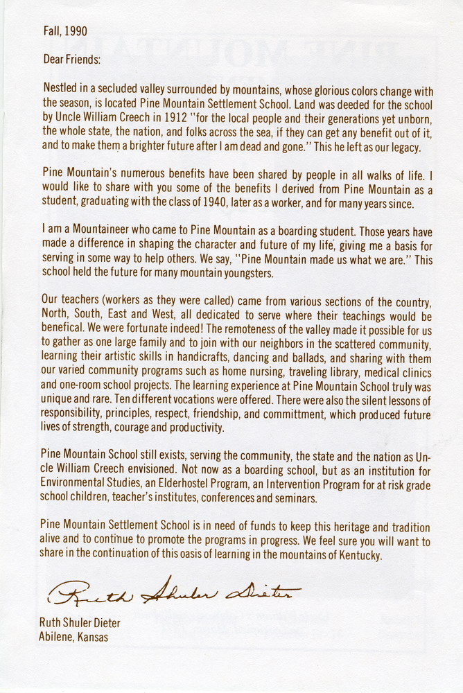 Since 1913, when Pine Mountain Settlement School began, its story of creative, unique responses to the needs of “its” valley has been told in a series of Pine Mountain letters and notes. The School’s devotion to bringing the best to that valley, its children, and its extended, inter-connected area, shines through those letters, which have communicated the aspirations, challenges, needs and successes of Pine Mountain Settlement School.