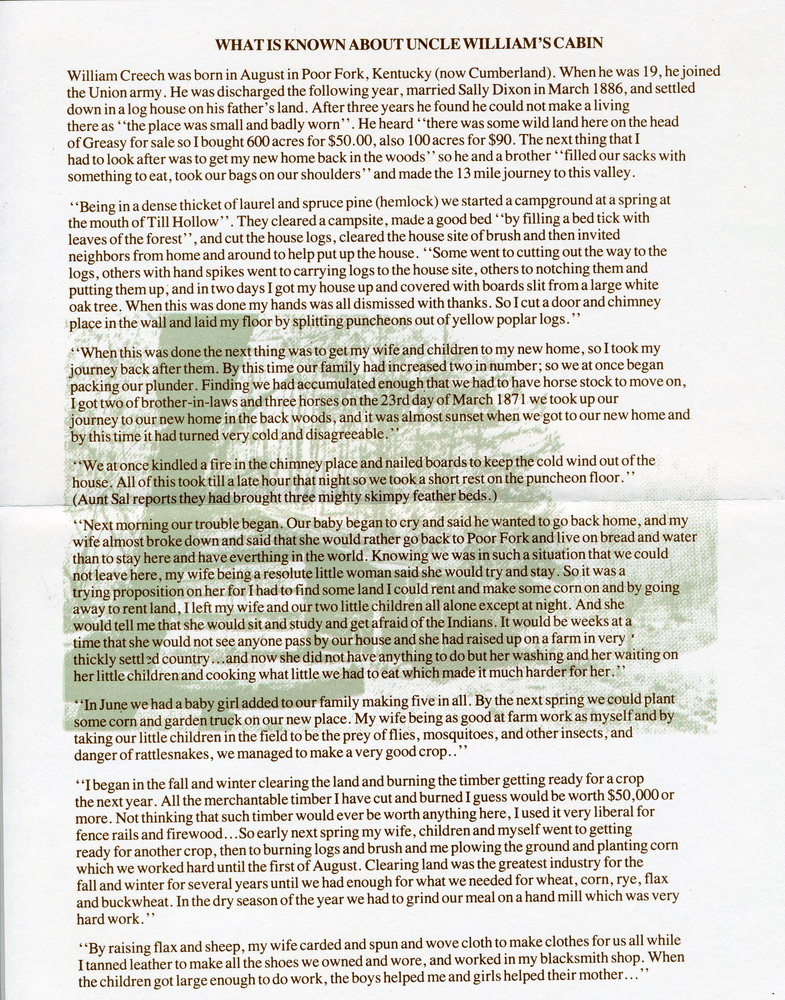 William Creech was born in August in Poor Fork, Kentucky (now Cumberland). When he was 19, he joined the Union army. He was discharged the following year, married Sally Dixon in March 1886, and settled down in a log house on his father’s land. After three years he found he could not make a living there as “the place was small and badly worn”. He heard “there was some wild land here on the head of Greasy for sale so I bought 600 acres for $50.00, also 100 acres for $90. The next thing that I had to look after was to get my new home back in the woods” so he and a brother “filled our sacks with something to eat, took our bags on our shoulders” and made the 13 mile journey to this valley. “Being in a dense thicket of laurel and spruce pine (hemlock) we started a campground at a spring at the mouth of Till Hollow”. They cleared a campsite, made a good bed “by filling a bed tick with leaves of the forest”, and cut the house logs, cleared the house site of brush and then invited neighbors from home and around to help put up the house. “Some went to cutting out the way to the logs, others with hand spikes went to carrying logs to the house site, others to notching them and putting them up, and in two days I got my house up and covered with boards slit from a large white oak tree. When this was done my hands was all dismissed with thanks. So I cut a door and chimney place in the wall and laid my floor by splitting puncheons out of yellow poplar logs.”