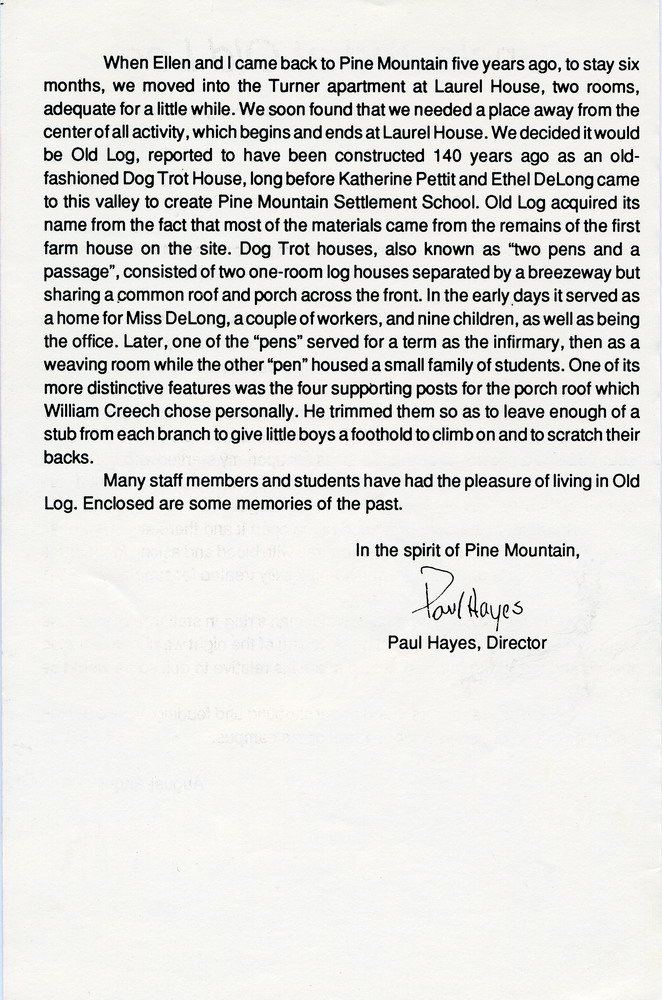 Many staff members and students have had the pleasure of living in Old Log. Enclosed are some memories of the past.