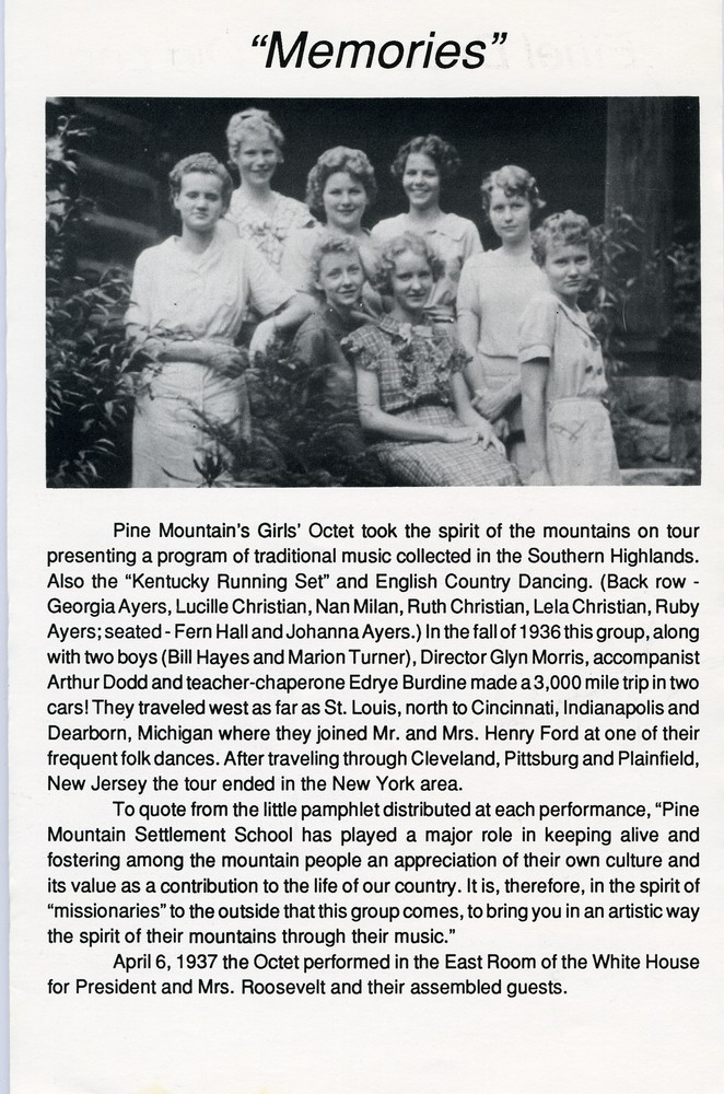 …[I]n the spirit of “missionaries” to the outside…[the Pine Mountain Girls’ Octet] comes, to bring you in an artistic way the spirit of their mountains through their music. – Excerpt from a 1936 pamphlet distributed at performances.