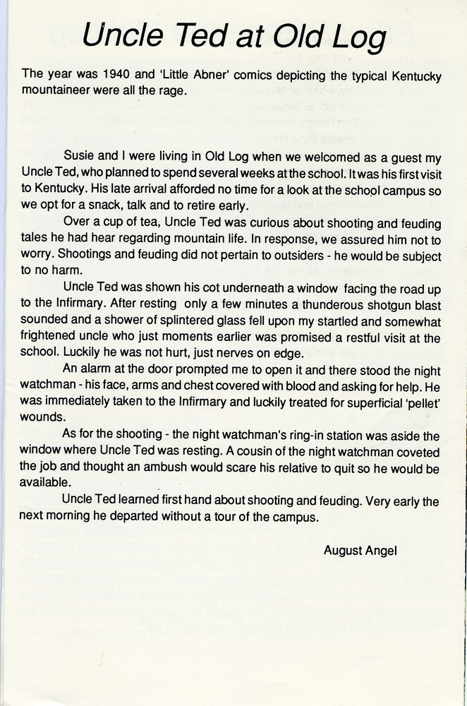 Susie [Hall Angel] and I were living in Old Log when we welcomed as a guest my Uncle Ted, who planned to spend several weeks at the school. It was his first visit to Kentucky. His late arrival afforded no time for a look at the school campus so we opt for a snack, talk and to retire early.
