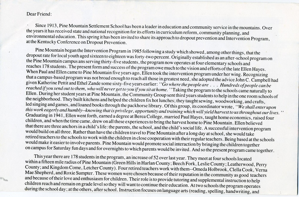 Pine Mountain began the Intervention Program in 1985 following a study which showed, among other things, that the dropout rate for local youth aged sixteen to eighteen was forty-two percent. Originally established as an after-school program on the Pine Mountain campus [and] serving thirty-five students, the program now operates at four elementary schools and reaches 178 students. The present form and success of the program owe much to the vision and efforts of the late Ellen Hayes. When Paul and Ellen came to Pine Mountain five years ago, Ellen took the intervention program under her wing. Recognizing that a campus-based program was not broad enough to reach all those in greatest need, she adopted the advice John C. Campbell had given Katherine Pettit and Ethel Zande some sixty-five years earlier: “Go where the people are . . . Hundreds of people can be reached if you send out to them, who will never get to you if you sit at home.” Taking the program to the schools came naturally to Ellen. During her student years at Pine Mountain, the Community Group sent third years students to help in the one room schools of the neighborhood. They built kitchens and helped the children fix hot lunches; they taught sewing, woodworking, and crafts, led singing and games, and loaned books through the packhorse library. Of this group, its coordinator wrote, “We shall enter upon this work eagerly and humbly — knowing that is privilege, [opportunity] and training which will yield harvest to us throughout our lives.” Graduating in 1941, Ellen went forth, earned a degree at Berea College, married Paul Hayes, taught home economics, raised four children, and when the time came, drew on all these experiences to bring the harvest home to Pine Mountain. Ellen believed that there are three anchors in a child’s life: the parents, the school, and the child’s social life. A successful intervention program would build on all three. Rather than have the children travel to Pine Mountain after a long day at school, she would take retired teachers to the schools to work with the children in close cooperation with their regular teachers. Being based at the schools would make it easier to involve parents. Pine Mountain would promote social interaction by bringing the children together on campus for Saturday fun days and for overnights to which parents would be invited. And so the present program came together.