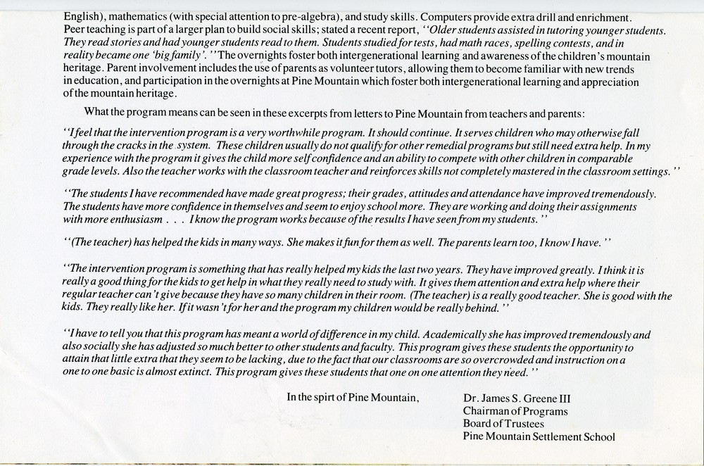 …English), mathematics (with special attention to pre-algebra), and study skills. Computers provide extra drill and enrichment. Peer teaching is part of a larger plan to build social skills; stated a recent report, “Older students assisted in tutoring younger students. They read stories and had younger students read to them. Students studied for tests, had math races, spelling contests, and in reality became one ‘big family’.” The overnights foster both intergenerational learning and awareness of the children’s mountain heritage. Parent involvement includes the use of parents as volunteer tutors, allowing them to become familiar with new trends in education, and participation in the overnights at Pine Mountain which foster both intergenerational learning and appreciation of the mountain heritage.