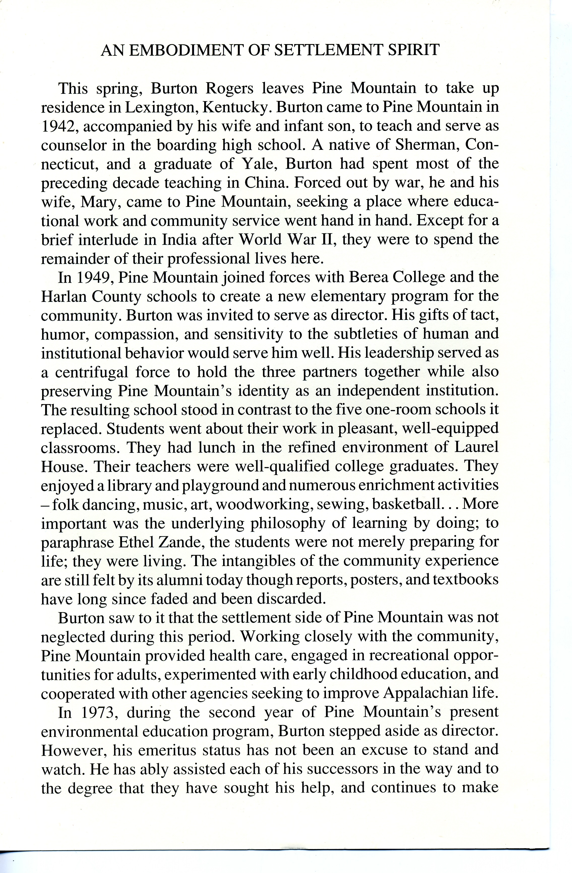 [Burton Rogers’] leadership [in the new elementary school program] served as a centrifugal force to hold the three partners [Berea College, Harlan County schools, and Pine Mountain School] together while also preserving Pine Mountain’s identity as an independent institution. – James S. Greene III