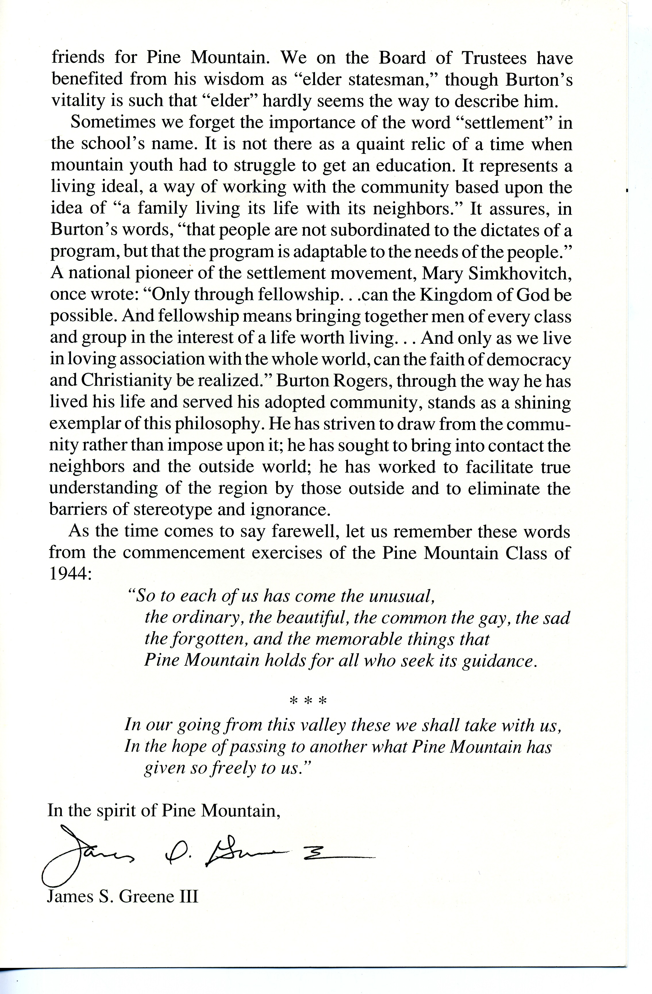 As the time comes to say farewell, let us remember these words from the commencement exercises of the Pine Mountain Class of 1944: